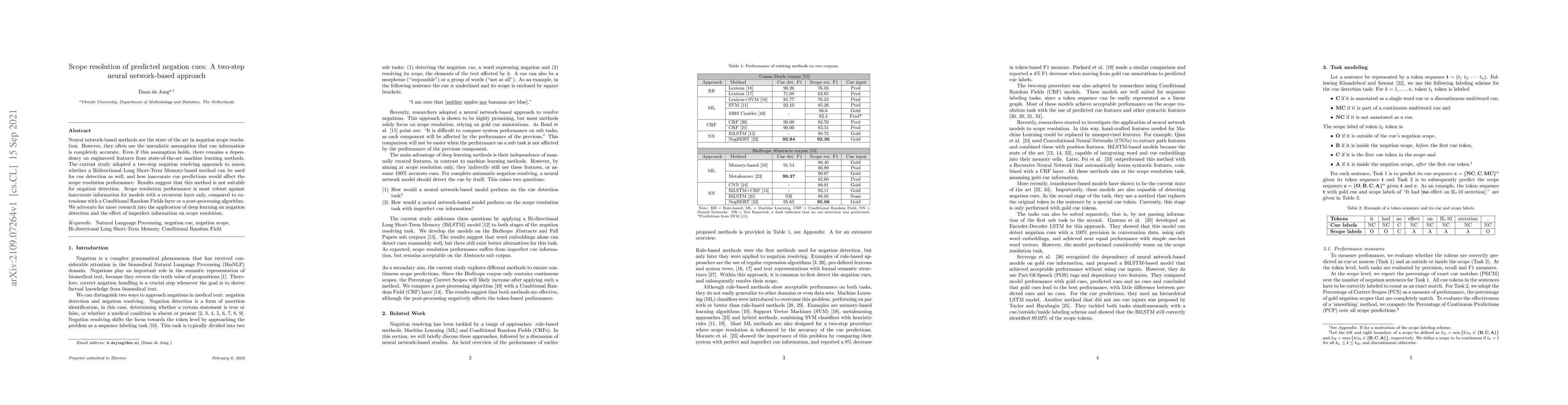 The paper proposes a two-step neural network-based approach for negation scope resolution, evaluating the effectiveness of BiLSTM for cue detection and analyzing the impact of inaccurate cue predictions on scope resolution.