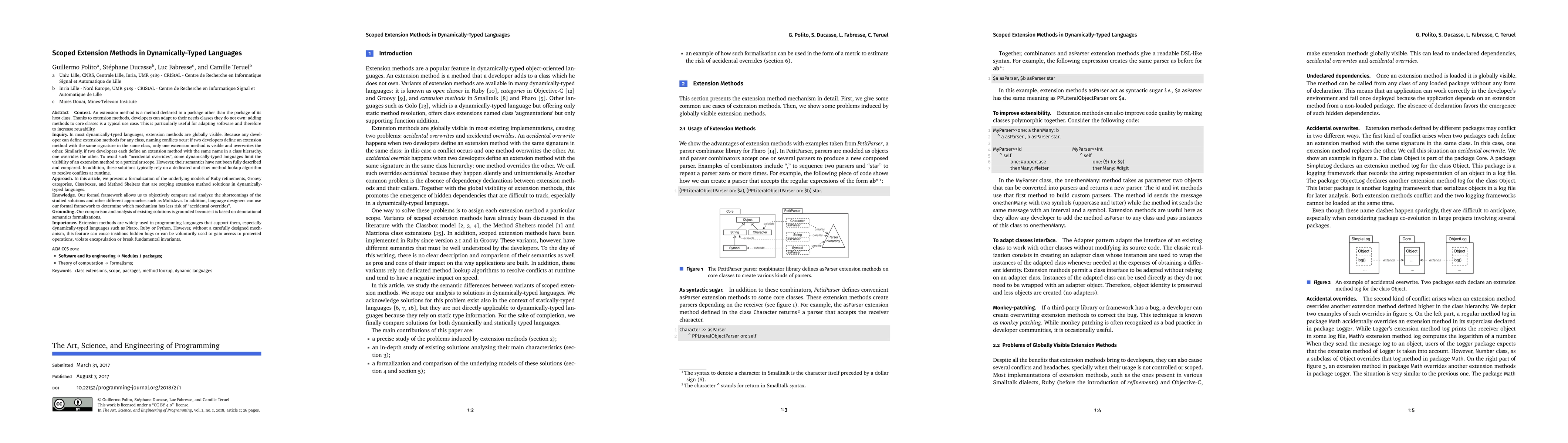This paper formalizes and compares scoping mechanisms for extension methods in dynamically-typed languages to prevent naming conflicts and accidental overrides, providing a robust framework for language designers to evaluate and select appropriate solutions.