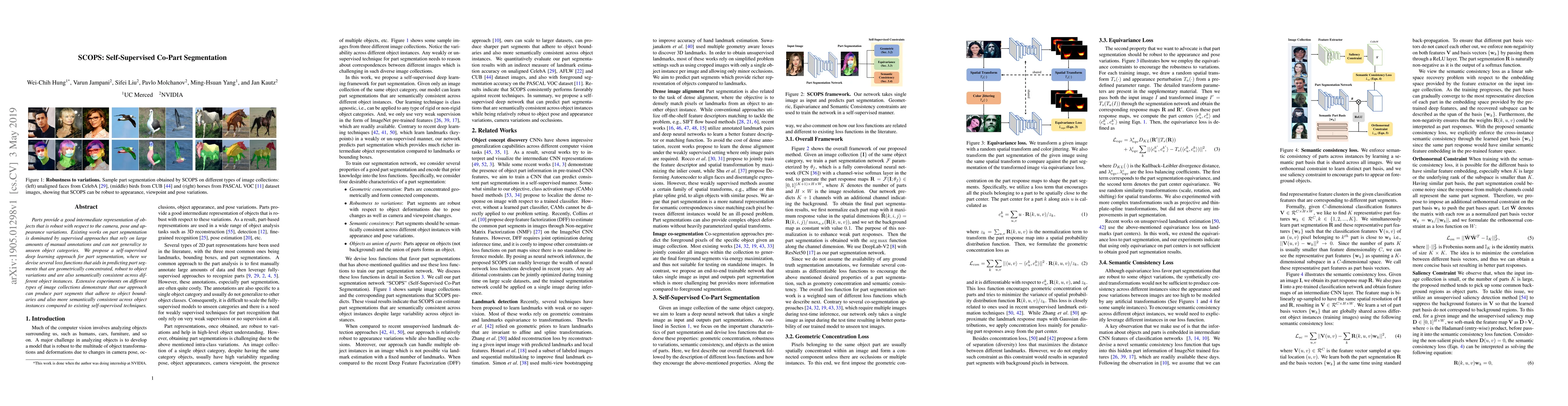SCOPS introduces a self-supervised deep learning framework for co-part segmentation, leveraging geometric concentration and semantic consistency through innovative loss functions. Experiments show its superior performance in producing accurate, generalized part segments compared to existing self-supervised methods.