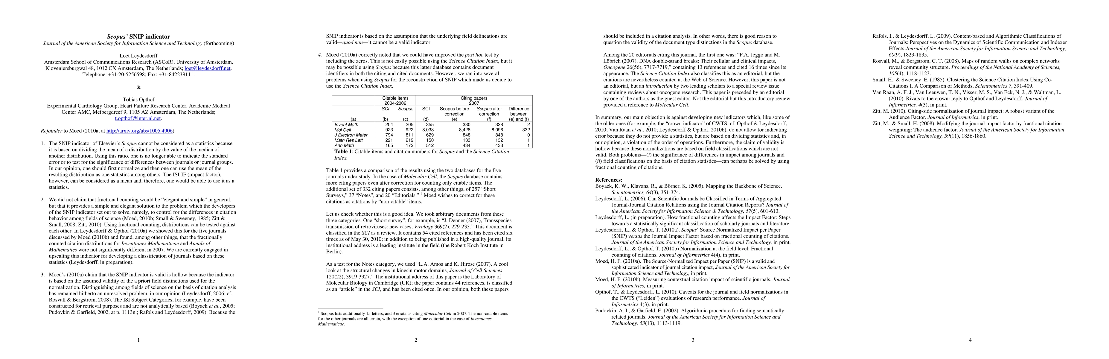 Rejoinder to Moed [arXiv:1005.4906]: Our main objection is against developing new indicators which, like some of the older ones (for example, the "crown indicator" of CWTS), do not allow for indicating error because they do not provide a statistics, but are based, in our opinion, on a violation of the order of operations. The claim of validity for the SNIP indicator is hollow because the normalizations are based on field classifications which are not valid. Both problems can perhaps be solved by using fractional counting.