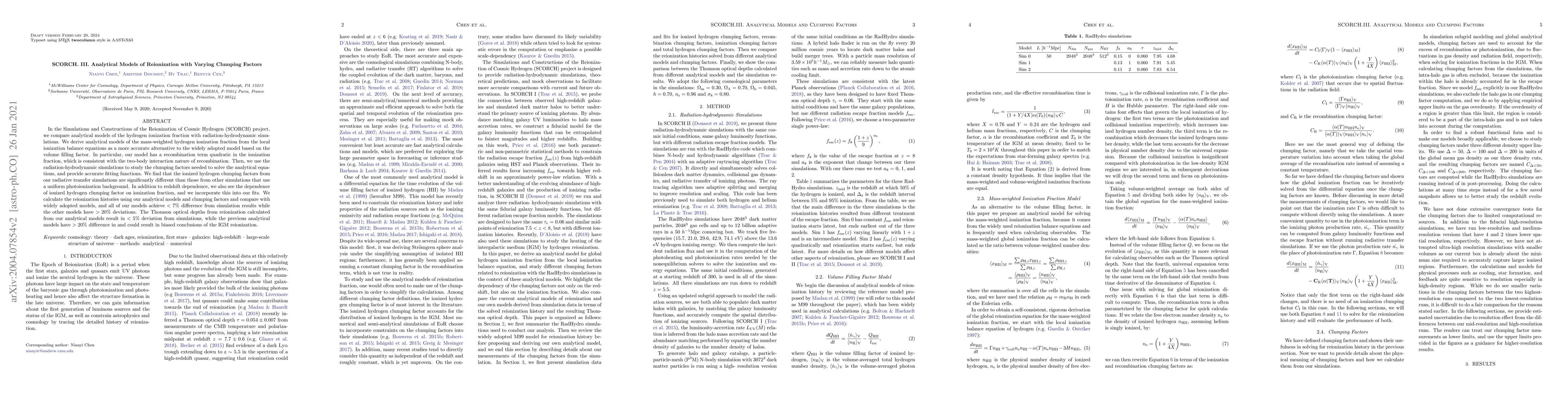 The SCORCH. III paper develops improved analytical models for the hydrogen ionization fraction during cosmic reionization, incorporating a recombination term and varying clumping factors. These models show less than 7% deviation from simulation results, compared to over 20% for previous models, and provide more accurate estimates of reionization histories and Thomson optical depths.