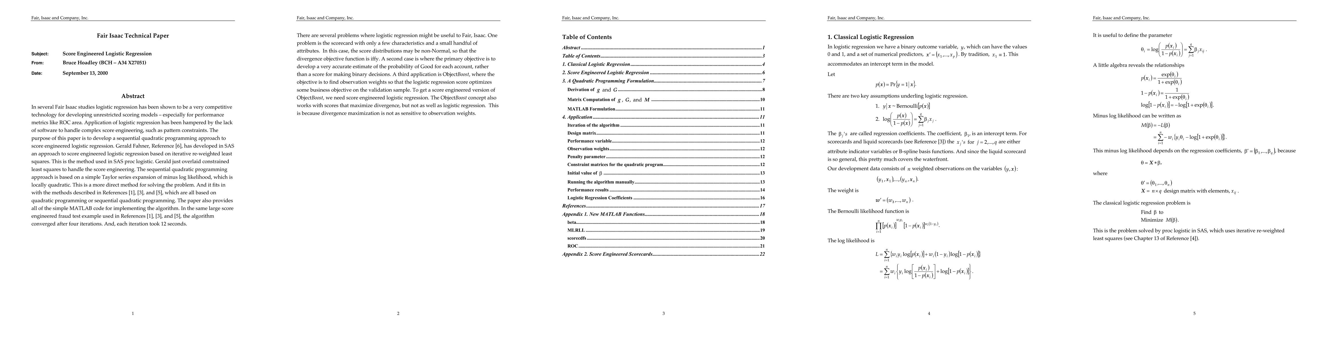 In several FICO studies logistic regression has been shown to be a very competitive technology for developing unrestricted scoring models, especially for performance metrics like ROC area. Application of logistic regression has been hampered by the lack of software to handle complex score engineering such as shape and pattern constraints. The purpose of this paper is to develop a sequential quadratic programming algorithm for score engineered logistic regression. This approach is based on a simple Taylor series expansion of minus log likelihood, which is locally quadratic. and fits in with the method that applies quadratic programming to B-Splines.