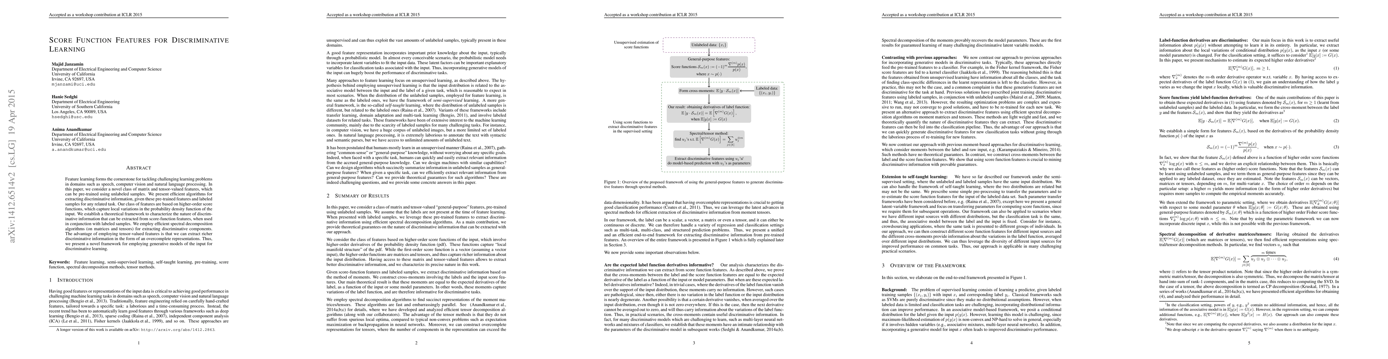 This paper introduces a novel class of matrix and tensor-valued features based on higher-order score functions, which can be pre-trained using unlabeled data. It presents efficient algorithms for extracting discriminative information from these features when combined with labeled samples, leveraging spectral decomposition for richer, overcomplete representations.
