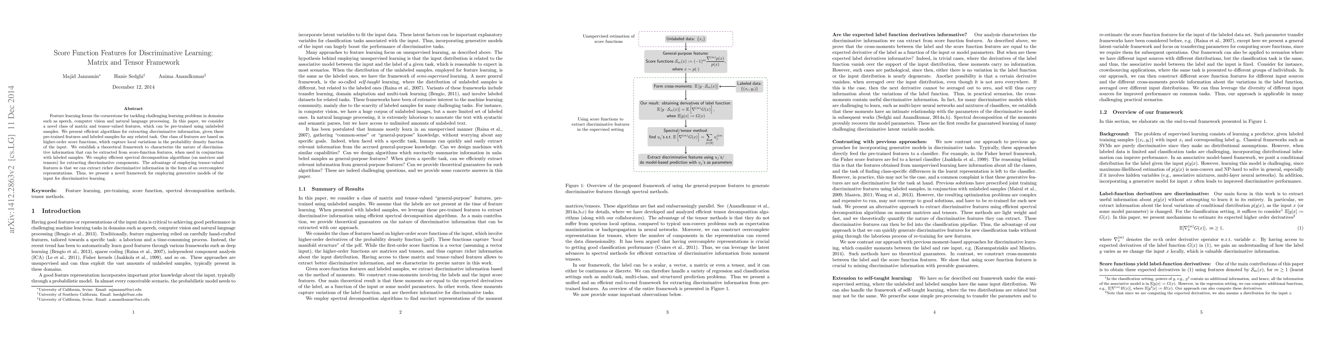 This paper introduces a novel class of matrix and tensor-valued features based on higher-order score functions for discriminative learning. It presents efficient algorithms for extracting discriminative information using these features, leveraging spectral decomposition for richer, overcomplete representations.