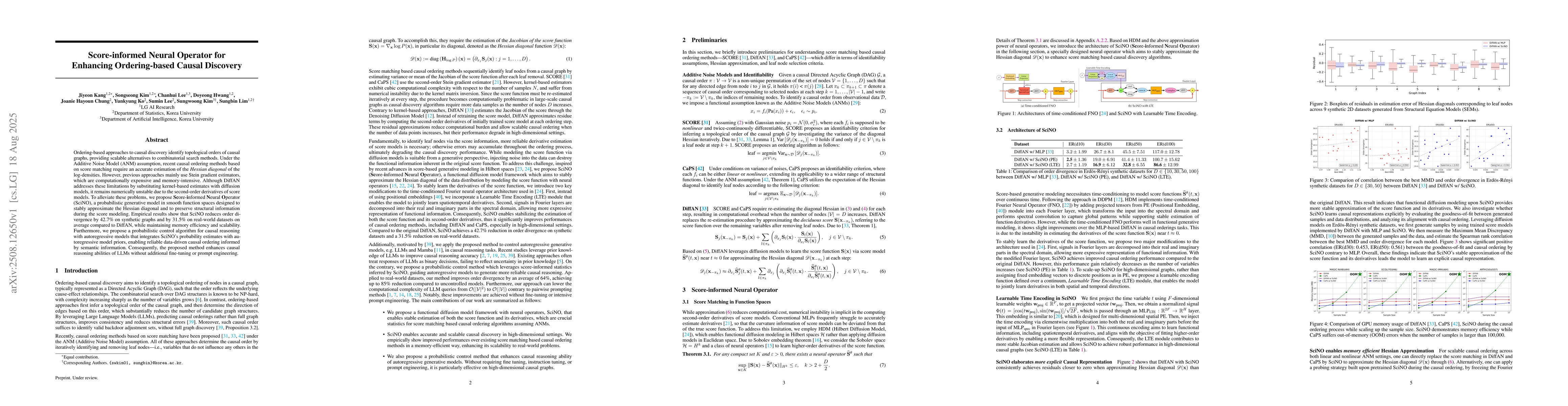 Ordering-based approaches to causal discovery identify topological orders of causal graphs, providing scalable alternatives to combinatorial search methods. Under the Additive Noise Model (ANM) assumption, recent causal ordering methods based on score matching require an accurate estimation of the Hessian diagonal of the log-densities. However, previous approaches mainly use Stein gradient estimators, which are computationally expensive and memory-intensive. Although DiffAN addresses these limitations by substituting kernel-based estimates with diffusion models, it remains numerically unstable due to the second-order derivatives of score models. To alleviate these problems, we propose Score-informed Neural Operator (SciNO), a probabilistic generative model in smooth function spaces designed to stably approximate the Hessian diagonal and to preserve structural information during the score modeling. Empirical results show that SciNO reduces order divergence by 42.7% on synthetic graphs and by 31.5% on real-world datasets on average compared to DiffAN, while maintaining memory efficiency and scalability. Furthermore, we propose a probabilistic control algorithm for causal reasoning with autoregressive models that integrates SciNO's probability estimates with autoregressive model priors, enabling reliable data-driven causal ordering informed by semantic information. Consequently, the proposed method enhances causal reasoning abilities of LLMs without additional fine-tuning or prompt engineering.