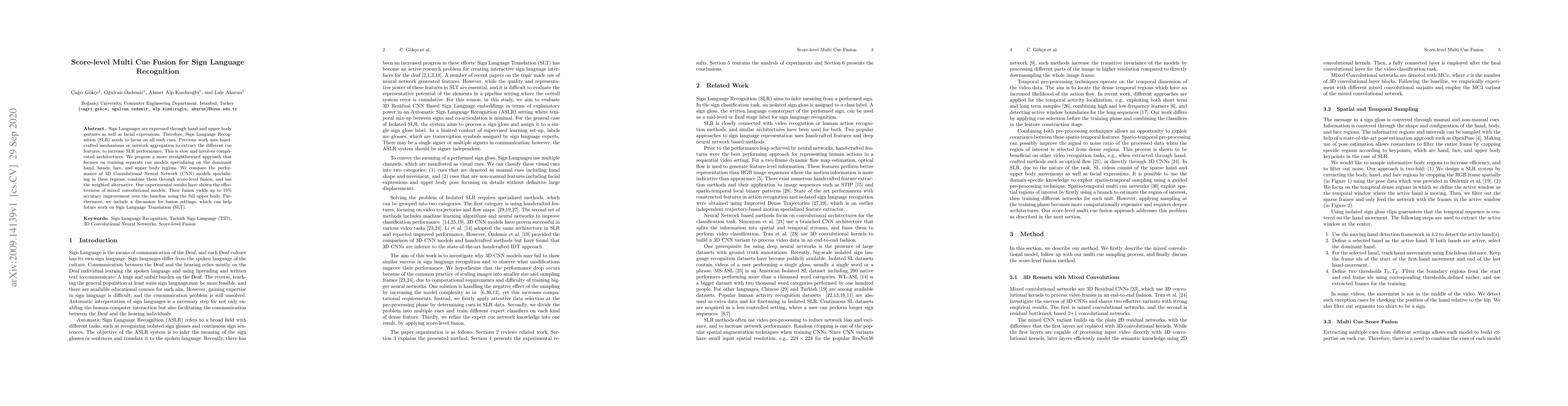 This paper proposes a method for Sign Language Recognition (SLR) that uses specialized 3D CNN models for hand, face, and upper body cues, combined through score-level fusion, achieving up to 19% accuracy improvement over traditional methods. The approach emphasizes simpler, region-specific models over complex network aggregations.