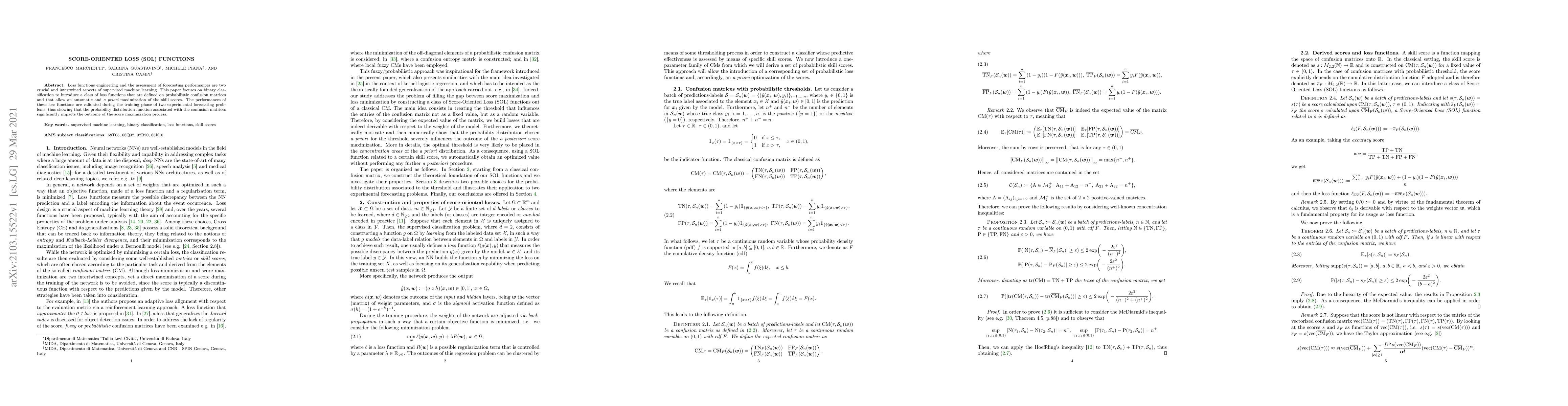 This paper introduces Score-oriented Loss (SOL) functions for binary classification, enabling automatic maximization of forecasting skill scores through probabilistic confusion matrices. Validation in two experiments demonstrates the impact of distribution function on score maximization outcomes.