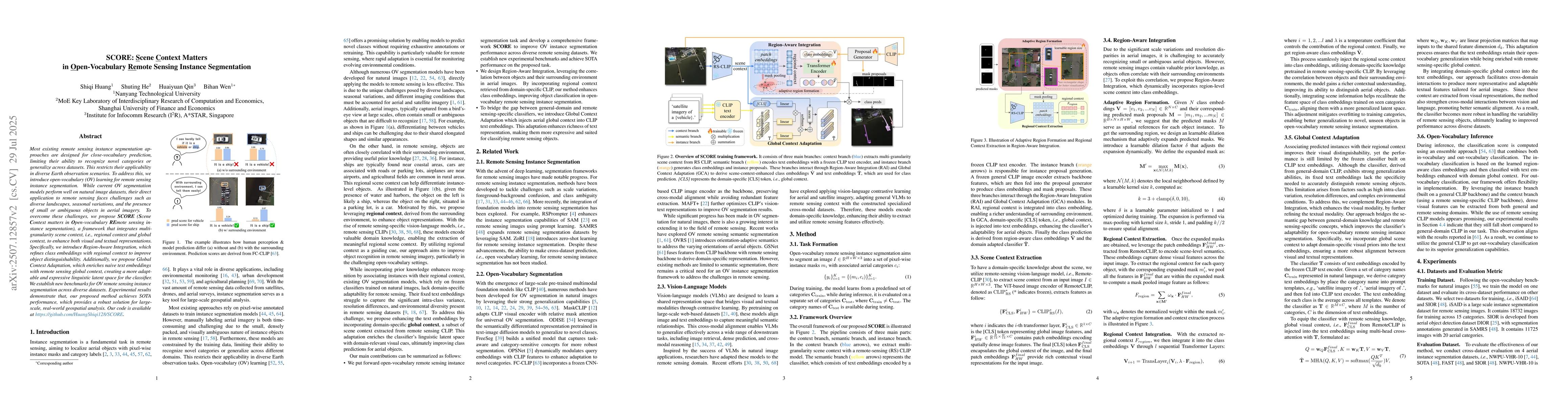 The paper introduces SCORE, a framework for open-vocabulary remote sensing instance segmentation, integrating multi-granularity scene context (regional and global) to enhance both visual and textual representations. It proposes Region-Aware Integration (RAI) for refining class embeddings with regional context and Global Context Adaptation (GCA) for enriching text embeddings with remote sensing global context.