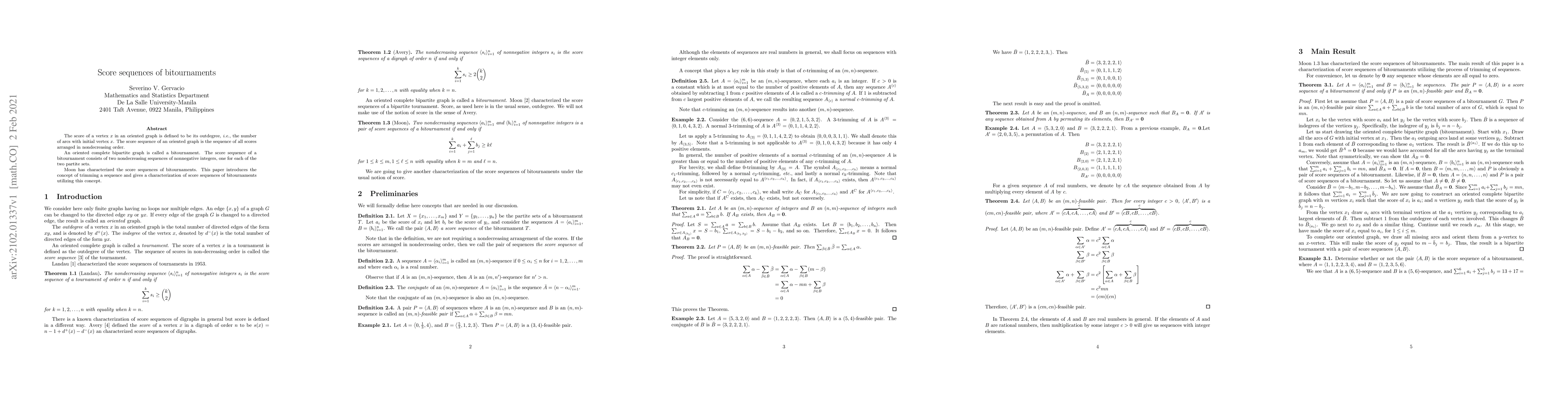 The score of a vertex $x$ in an oriented graph is defined to be its outdegree, \emph{i.e.}, the number of arcs with initial vertex $x$. The score sequence of an oriented graph is the sequence of all scores arranged in nondecreasing order. An oriented complete bipartite graph is called a bitournament. The score sequence of a bitournament consists of two nondecreasing sequences of nonnegative integers, one for each of the two partite sets. Moon has characterized the score sequences of bitournaments. This paper introduces the concept of trimming a sequence and gives a characterization of score sequences of bitournaments utilizing this concept.