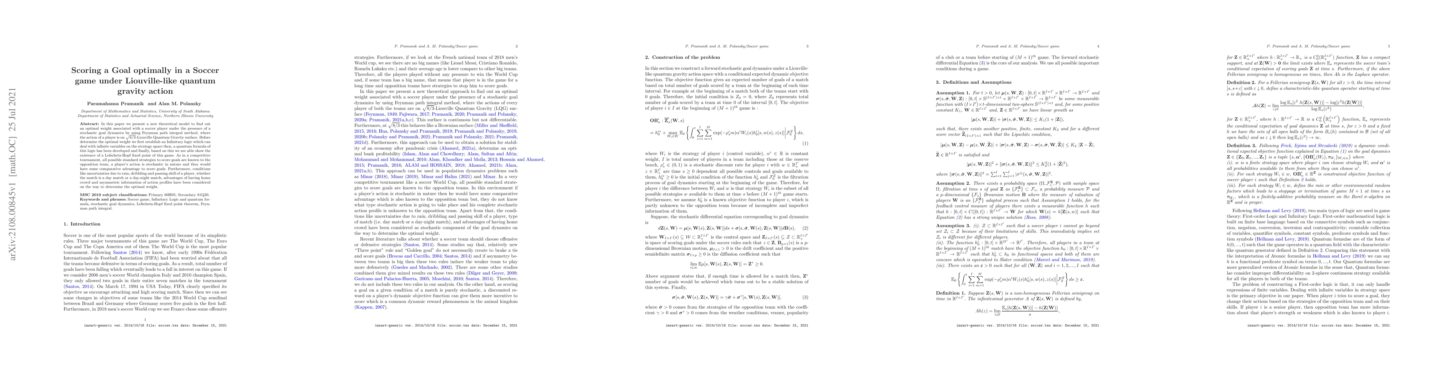 In this paper we present a new theoretical model to find out an optimal weight associated with a soccer player under the presence of a stochastic goal dynamics by using Feynman path integral method, where the action of a player is on $\sqrt{8/3}$-Liouville Quantum Gravity surface. Before determine the optimal weight we first establish an Infinitary logic which can deal with infinite variables on the strategy space then, a quantum formula of this logic has been developed and finally, based on this we are able show the existence of a Lefschetz-Hopf fixed point of this game. As in a competitive tournament, all possible standard strategies to score goals are known to the opposition team, a player's action is stochastic in nature and they would have some comparative advantage to score goals. Furthermore, conditions like uncertainties due to rain, dribbling and passing skill of a player, whether the match is a day match or a day-night match, advantages of having home crowd and asymmetric information of action profiles have been considered on the way to determine the optimal weight.