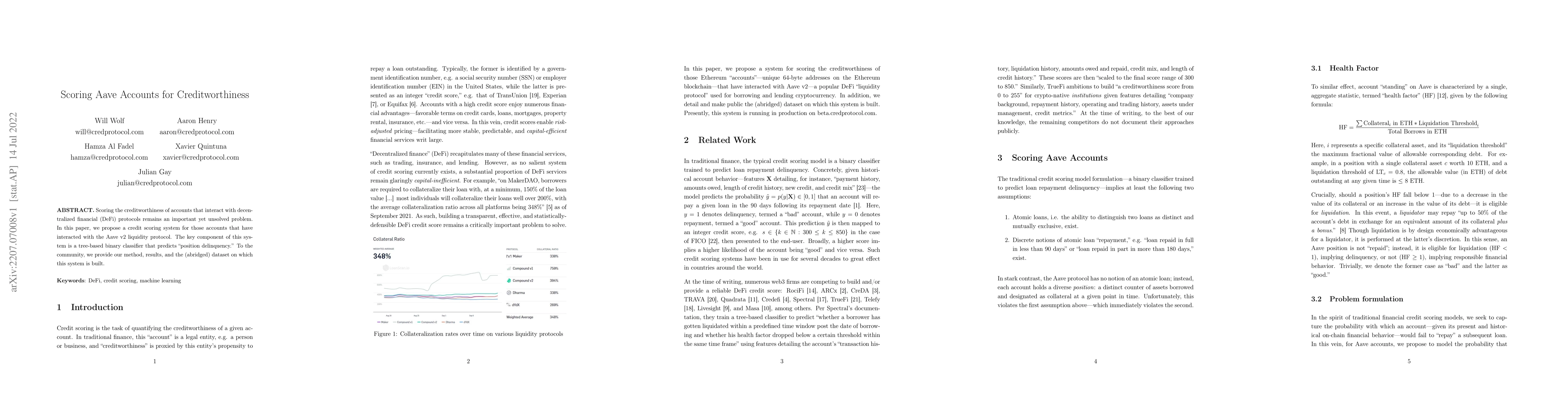 This paper proposes a credit scoring system for accounts interacting with Aave v2, using a tree-based binary classifier to predict "position delinquency." The authors share their method, results, and an abridged dataset to benefit the community.