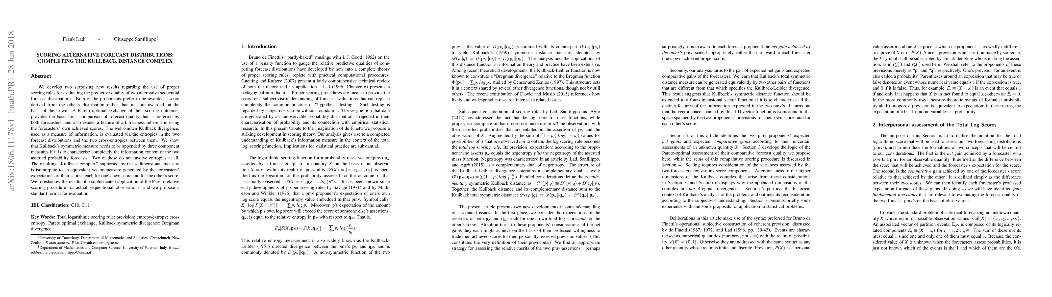 We develop two surprising new results regarding the use of proper scoring rules for evaluating the predictive quality of two alternative sequential forecast distributions. Both of the proponents prefer to be awarded a score derived from the other's distribution rather than a score awarded on the basis of their own. A Pareto optimal exchange of their scoring outcomes provides the basis for a comparison of forecast quality that is preferred by both forecasters, and also evades a feature of arbitrariness inherent in using the forecasters' own achieved scores. The well-known Kullback divergence, used as a measure of information, is evaluated via the entropies in the two forecast distributions and the two cross-entropies between them. We show that Kullback's symmetric measure needs to be appended by three component measures if it is to characterise completely the information content of the two asserted probability forecasts. Two of these do not involve entropies at all. The resulting 'Kullback complex' supported by the 4-dimensional measure is isomorphic to an equivalent vector measure generated by the forecasters' expectations of their scores, each for one's own score and for the other's score. We foreshadow the results of a sophisticated application of the Pareto relative scoring procedure for actual sequentional observations, and we propose a standard format for evaluation.