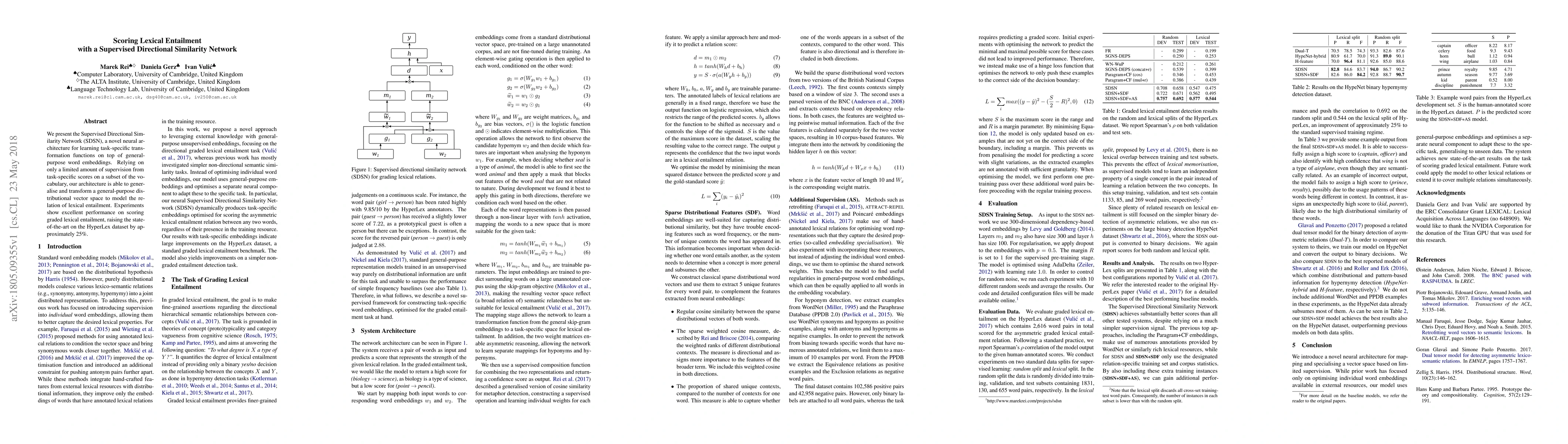 The paper introduces the Supervised Directional Similarity Network (SDSN), a neural architecture that leverages limited supervision to transform general-purpose word embeddings for lexical entailment. The SDSN achieves state-of-the-art results on the HyperLex dataset, improving performance by about 25%.