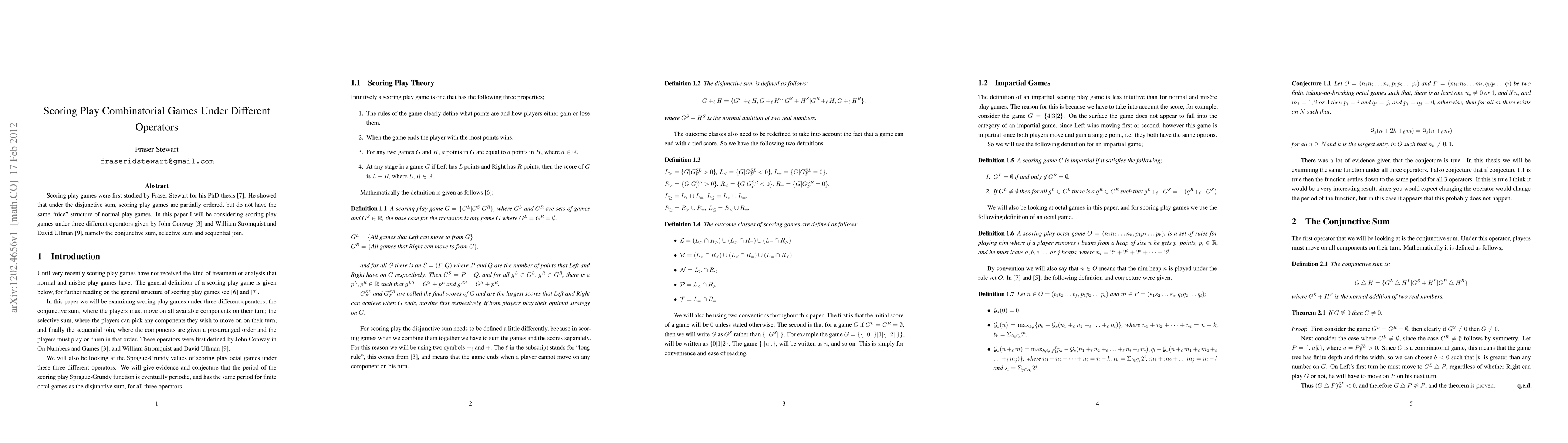 This paper explores scoring play combinatorial games under different operators, specifically the conjunctive sum, selective sum, and sequential join, contrasting their structures to those under the disjunctive sum. It aims to understand the unique properties of scoring play games beyond normal play games.