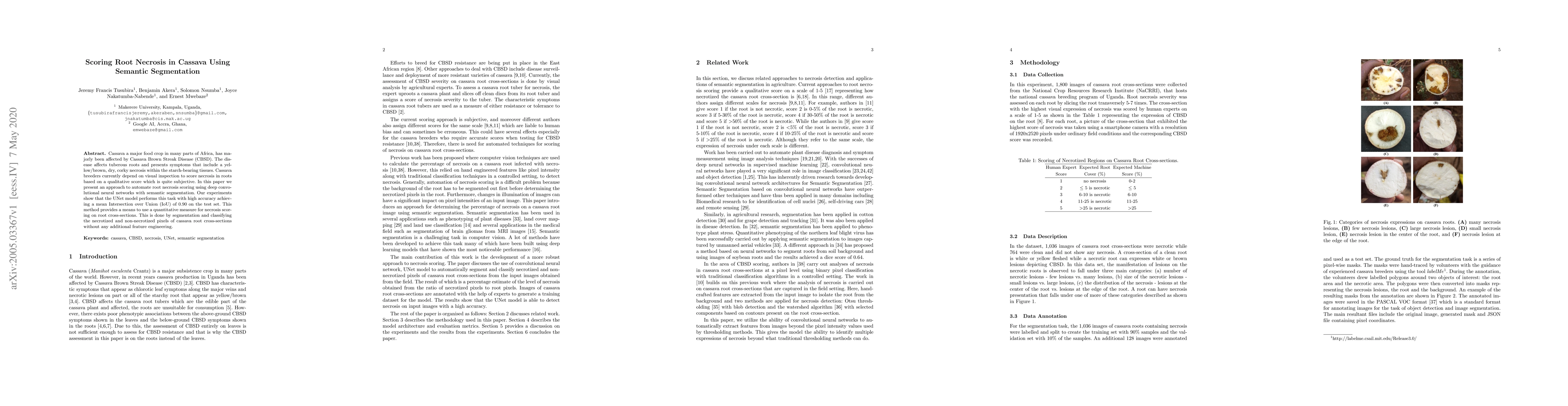 Cassava a major food crop in many parts of Africa, has majorly been affected by Cassava Brown Streak Disease (CBSD). The disease affects tuberous roots and presents symptoms that include a yellow/brown, dry, corky necrosis within the starch-bearing tissues. Cassava breeders currently depend on visual inspection to score necrosis in roots based on a qualitative score which is quite subjective. In this paper we present an approach to automate root necrosis scoring using deep convolutional neural networks with semantic segmentation. Our experiments show that the UNet model performs this task with high accuracy achieving a mean Intersection over Union (IoU) of 0.90 on the test set. This method provides a means to use a quantitative measure for necrosis scoring on root cross-sections. This is done by segmentation and classifying the necrotized and non-necrotized pixels of cassava root cross-sections without any additional feature engineering.
