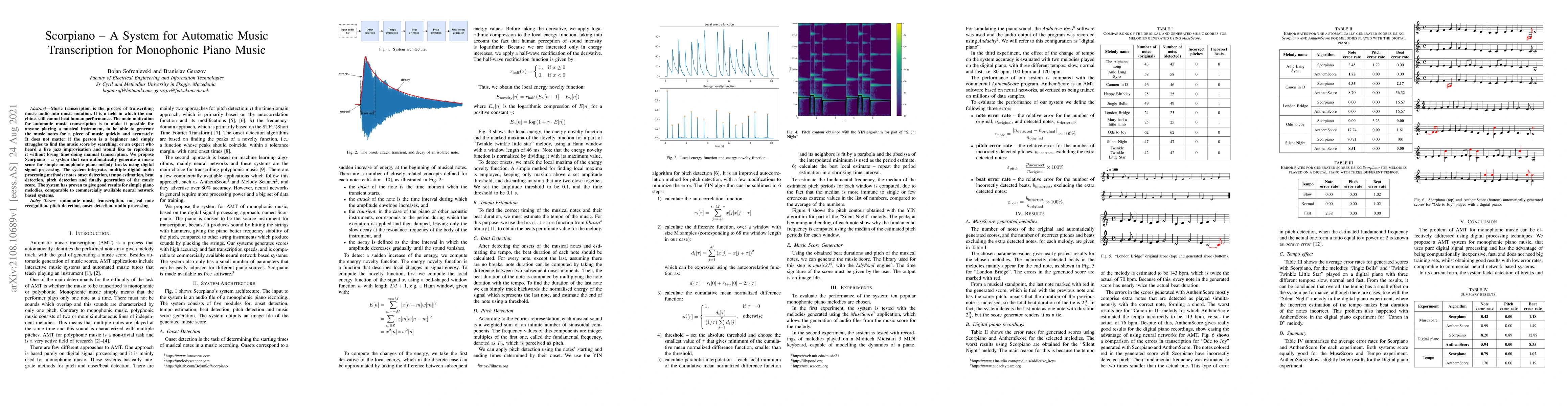 Scorpiano is an automatic music transcription system designed to convert monophonic piano audio into musical notation, employing digital signal processing for tasks like onset detection, tempo estimation, and pitch detection. It aims to assist musicians in quickly generating accurate music scores, rivaling the performance of neural network-based commercial systems.