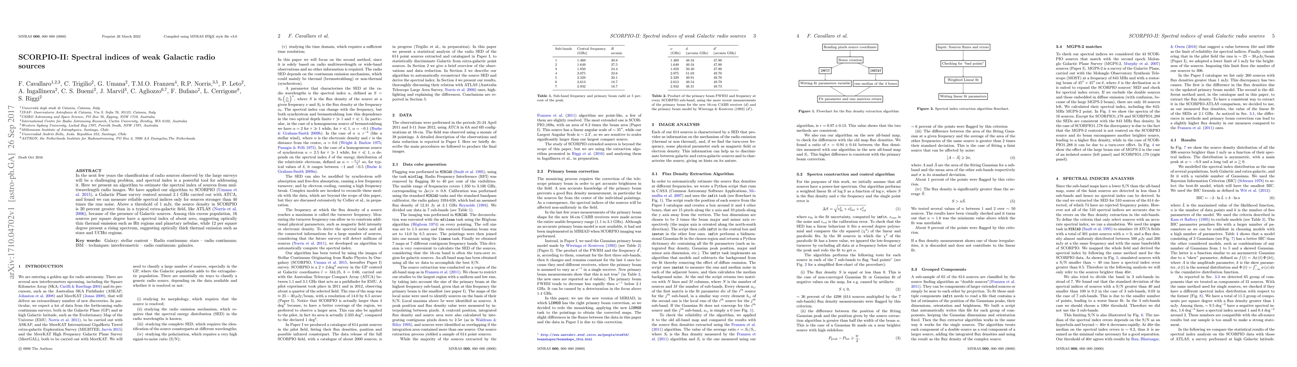 This paper introduces SCORPIO-II, an algorithm to estimate spectral indices of radio sources from multiwavelength images, applied to the Galactic Plane survey SCORPIO. Reliable spectral indices are measured for sources above 40 times the rms noise. The study finds a 20% higher source density in SCORPIO compared to extra-galactic fields, with 16 sources/sq deg having zero spectral index (optically thin emission) and 12 sources/sq deg showing a rising spectrum (optically thick emission).