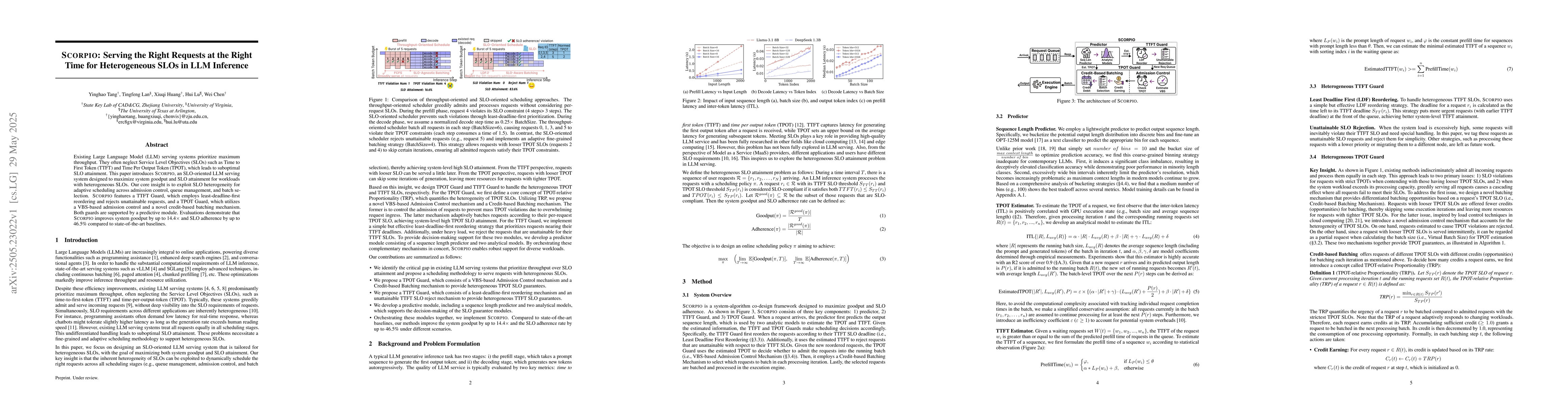 Existing Large Language Model (LLM) serving systems prioritize maximum throughput. They often neglect Service Level Objectives (SLOs) such as Time to First Token (TTFT) and Time Per Output Token (TPOT), which leads to suboptimal SLO attainment. This paper introduces SCORPIO, an SLO-oriented LLM serving system designed to maximize system goodput and SLO attainment for workloads with heterogeneous SLOs. Our core insight is to exploit SLO heterogeneity for adaptive scheduling across admission control, queue management, and batch selection. SCORPIO features a TTFT Guard, which employs least-deadline-first reordering and rejects unattainable requests, and a TPOT Guard, which utilizes a VBS-based admission control and a novel credit-based batching mechanism. Both guards are supported by a predictive module. Evaluations demonstrate that SCORPIO improves system goodput by up to 14.4X and SLO adherence by up to 46.5% compared to state-of-the-art baselines.