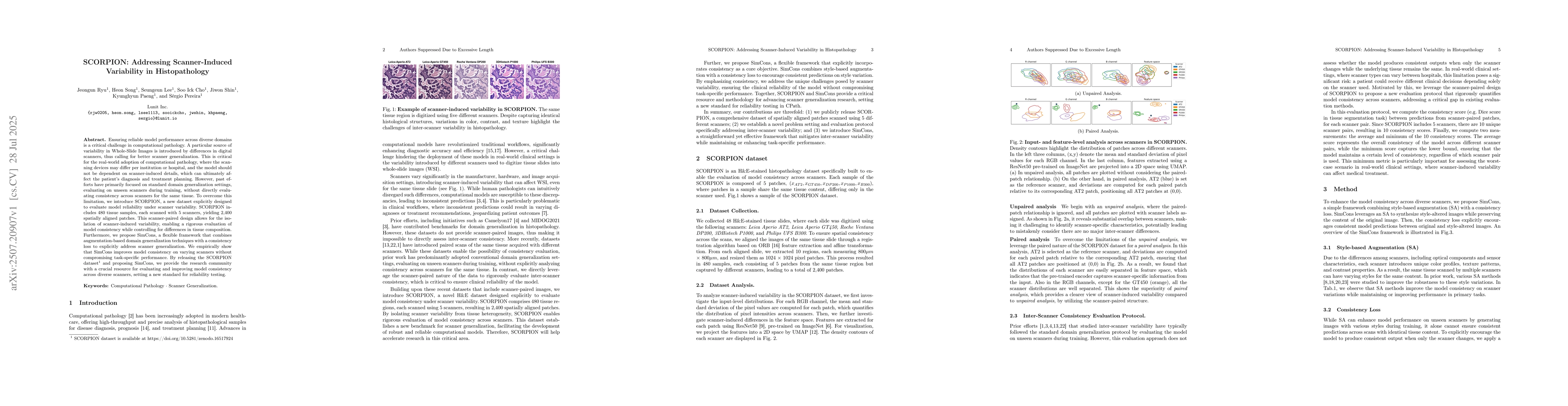Ensuring reliable model performance across diverse domains is a critical challenge in computational pathology. A particular source of variability in Whole-Slide Images is introduced by differences in digital scanners, thus calling for better scanner generalization. This is critical for the real-world adoption of computational pathology, where the scanning devices may differ per institution or hospital, and the model should not be dependent on scanner-induced details, which can ultimately affect the patient's diagnosis and treatment planning. However, past efforts have primarily focused on standard domain generalization settings, evaluating on unseen scanners during training, without directly evaluating consistency across scanners for the same tissue. To overcome this limitation, we introduce SCORPION, a new dataset explicitly designed to evaluate model reliability under scanner variability. SCORPION includes 480 tissue samples, each scanned with 5 scanners, yielding 2,400 spatially aligned patches. This scanner-paired design allows for the isolation of scanner-induced variability, enabling a rigorous evaluation of model consistency while controlling for differences in tissue composition. Furthermore, we propose SimCons, a flexible framework that combines augmentation-based domain generalization techniques with a consistency loss to explicitly address scanner generalization. We empirically show that SimCons improves model consistency on varying scanners without compromising task-specific performance. By releasing the SCORPION dataset and proposing SimCons, we provide the research community with a crucial resource for evaluating and improving model consistency across diverse scanners, setting a new standard for reliability testing.