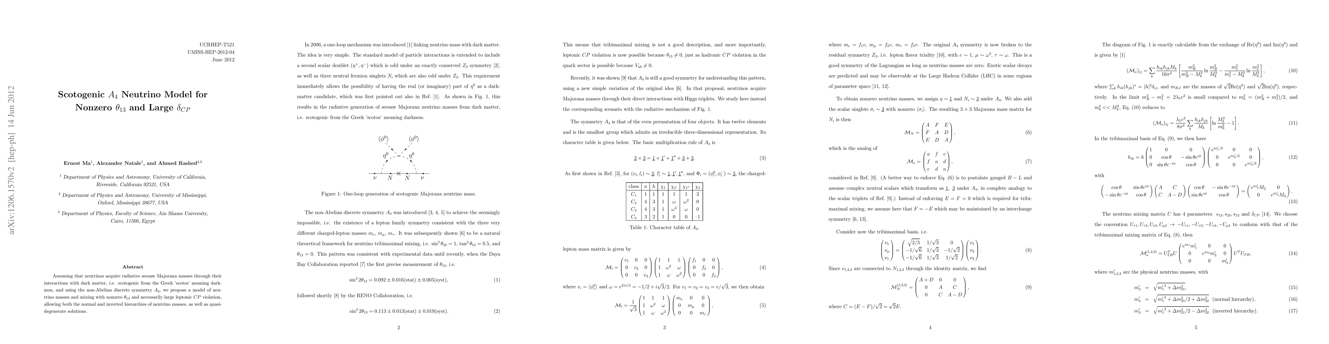 Assuming that neutrinos acquire radiative seesaw Majorana masses through their interactions with dark matter, i.e. scotogenic from the Greek 'scotos' meaning darkness, and using the non-Abelian discrete symmetry $A_4$, we propose a model of neutrino masses and mixing with nonzero $\theta_{13}$ and necessarily large leptonic CP violation, allowing both the normal and inverted hierarchies of neutrino masses, as well as quasi-degenerate solutions.