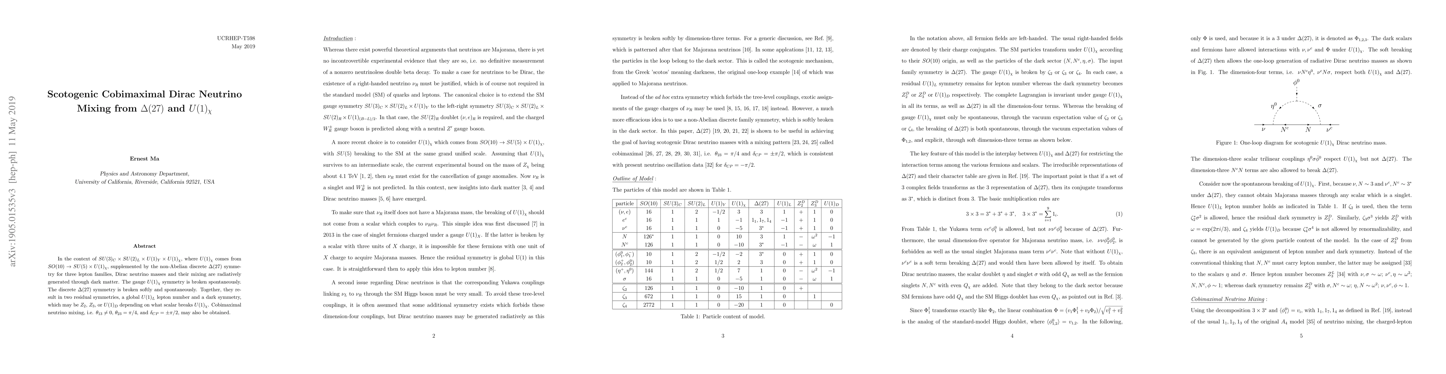 This paper explores a model within $SU(3)_C \times SU(2)_L \times U(1)_Y \times U(1)_\chi$ where radiative Dirac neutrino masses and mixing arise through dark matter. The $\Delta(27)$ symmetry and $U(1)_\chi$ symmetry lead to cobimaximal neutrino mixing and residual symmetries.