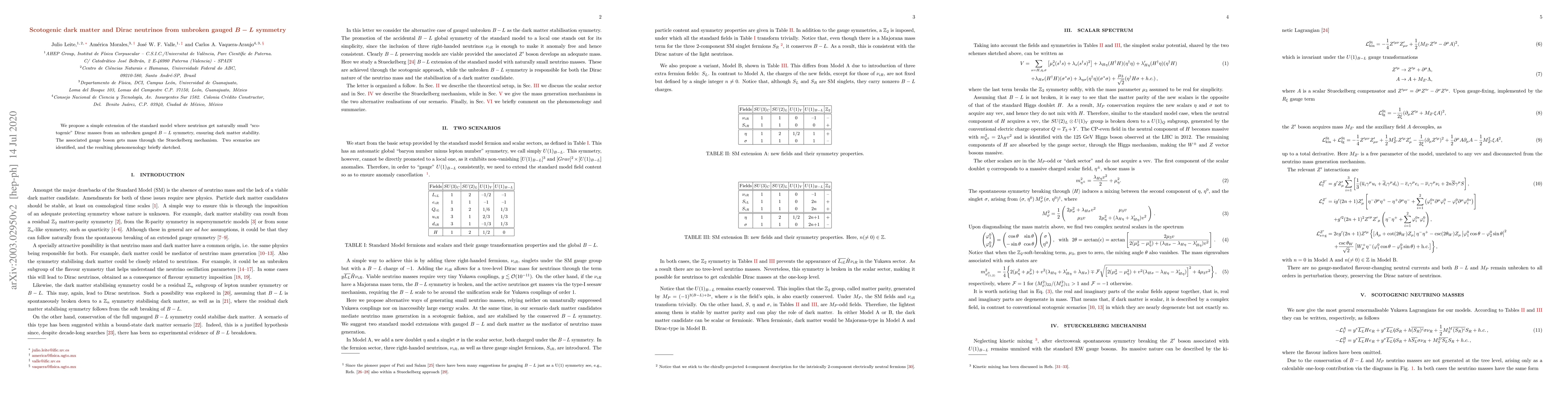 We propose a simple extension of the standard model where neutrinos get naturally small "scotogenic" Dirac masses from an unbroken gauged $B-L$ symmetry, ensuring dark matter stability. The associated gauge boson gets mass through the Stueckelberg mechanism. Two scenarios are identified, and the resulting phenomenology briefly sketched.