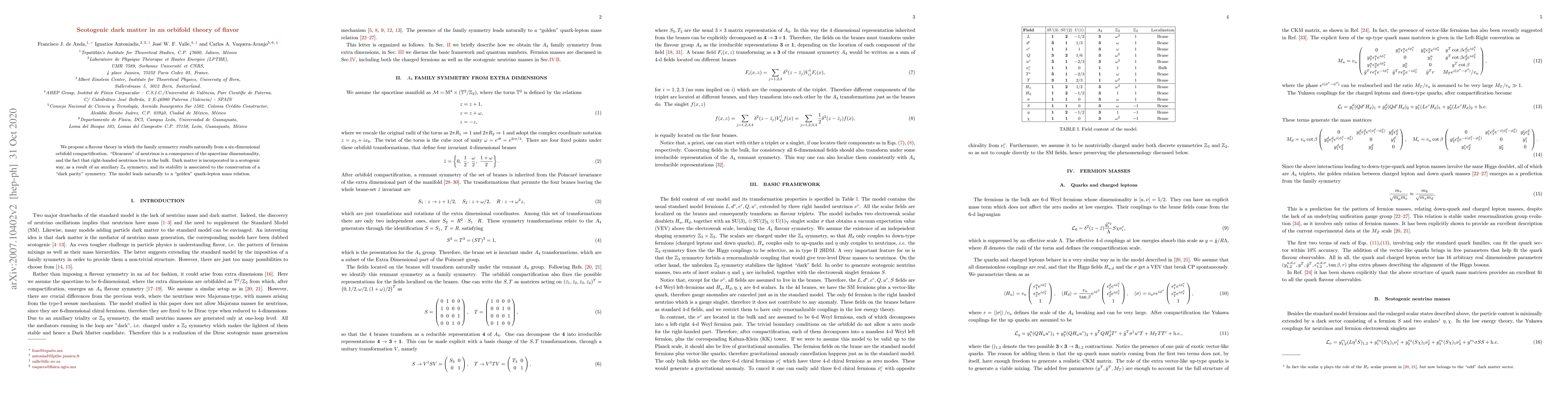We propose a flavour theory in which the family symmetry results naturally from a six-dimensional orbifold compactification. "Diracness" of neutrinos is a consequence of the spacetime dimensionality, and the fact that right-handed neutrinos live in the bulk. Dark matter is incorporated in a scotogenic way, as a result of an auxiliary $\mathbb{Z}_3$ symmetry, and its stability is associated to the conservation of a "dark parity" symmetry. The model leads naturally to a "golden" quark-lepton mass relation.