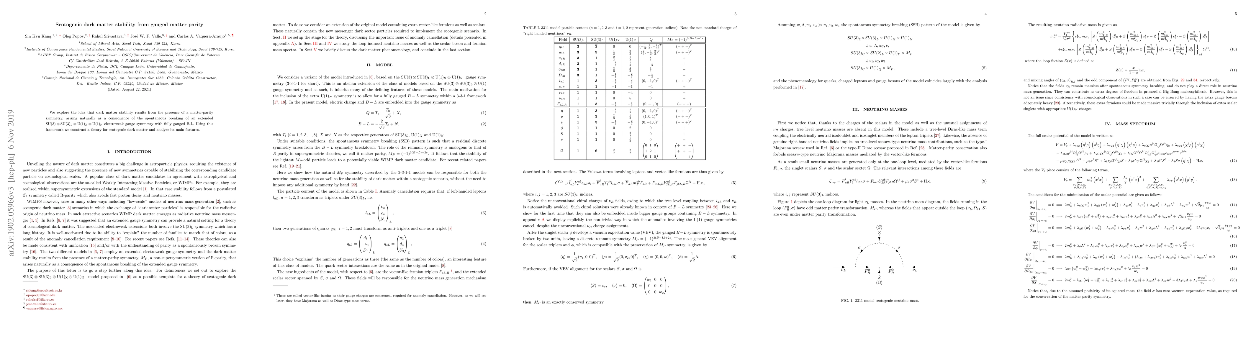 The paper investigates a scotogenic dark matter model where stability arises from a matter-parity symmetry, spontaneously generated by an extended gauge symmetry including $\mathrm{SU(3) \otimes SU(3)_L \otimes U(1)_X \otimes U(1)_{N}}$, and fully gauged B-L. It constructs and analyzes the theory's main features.