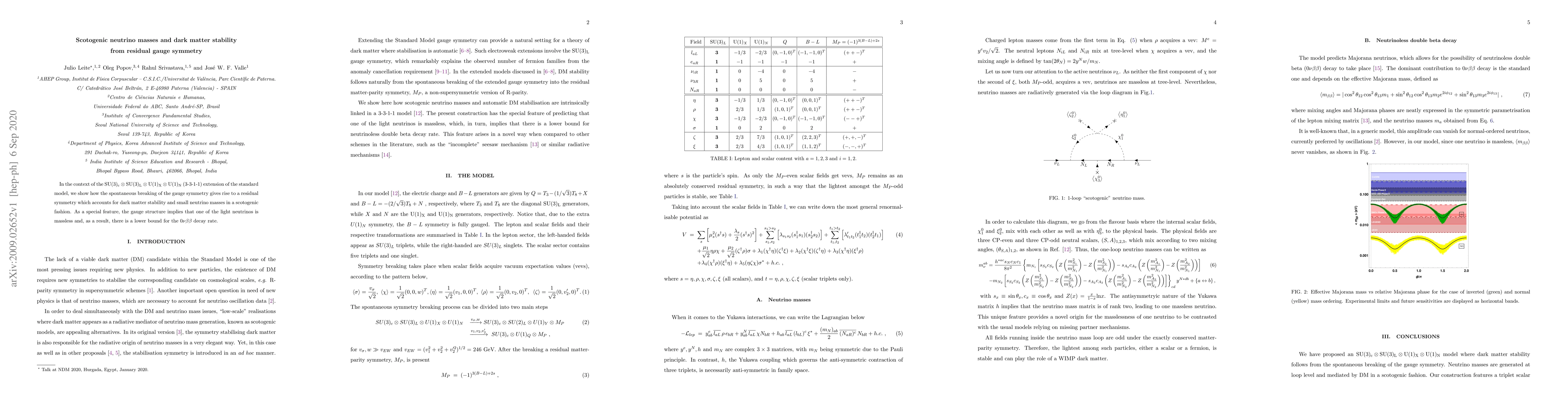 In the context of the $\mathrm{SU(3)_c \otimes SU(3)_L \otimes U(1)_X \otimes U(1)_{N}}$ (3-3-1-1) extension of the standard model, we show how the spontaneous breaking of the gauge symmetry gives rise to a residual symmetry which accounts for dark matter stability and small neutrino masses in a scotogenic fashion. As a special feature, the gauge structure implies that one of the light neutrinos is massless and, as a result, there is a lower bound for the $0\nu\beta\beta$ decay rate.