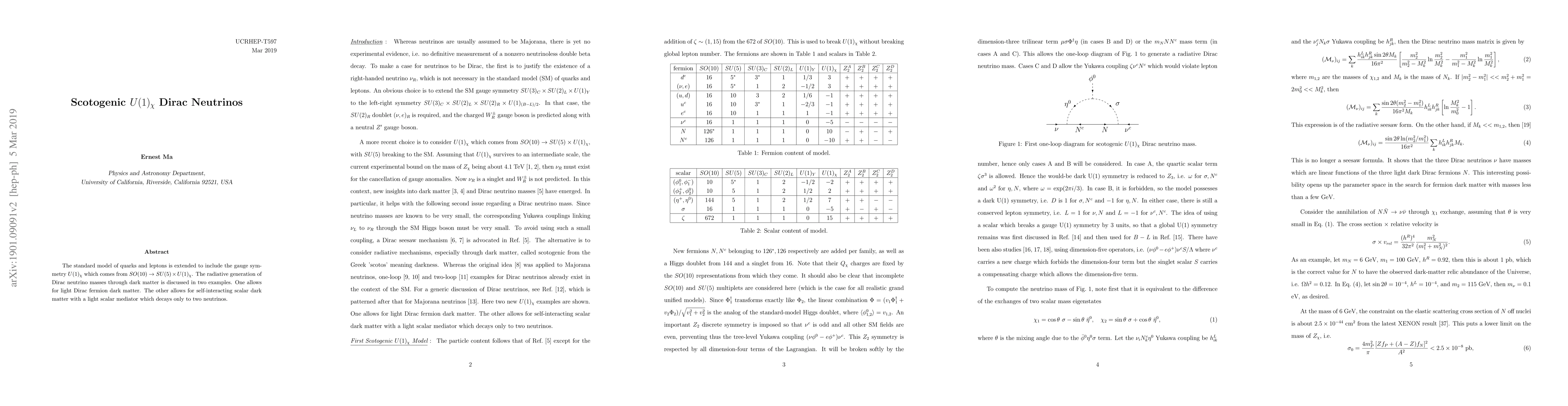 The standard model of quarks and leptons is extended to include the gauge symmetry $U(1)_\chi$ which comes from $SO(10) \to SU(5) \times U(1)_\chi$. The radiative generation of Dirac neutrino masses through dark matter is discussed in two examples. One allows for light Dirac fermion dark matter. The other allows for self-interacting scalar dark matter with a light scalar mediator which decays only to two neutrinos.