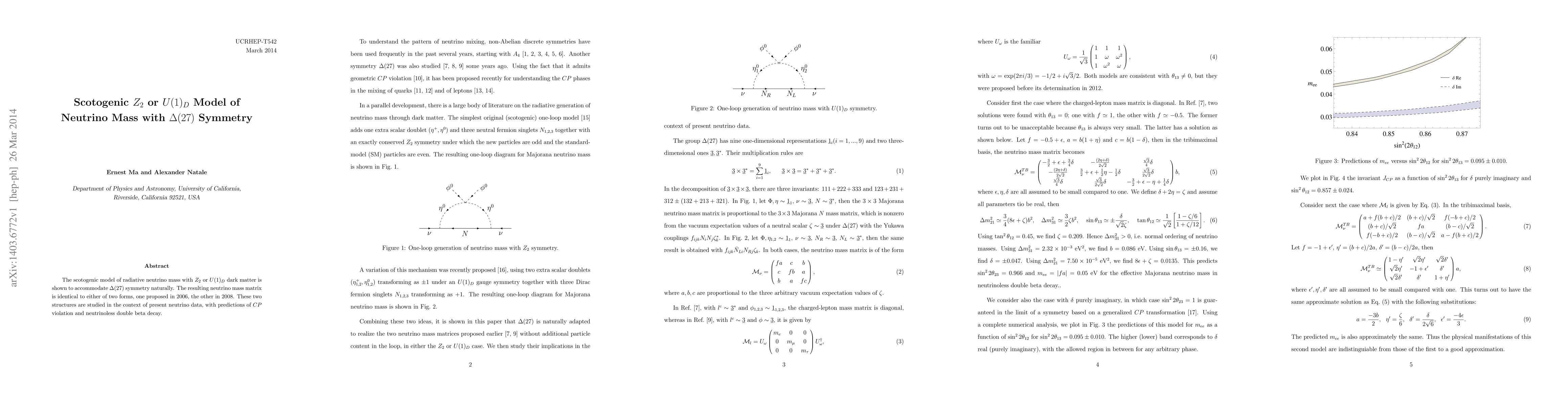 This paper explores the scotogenic model for neutrino mass generation, incorporating either $Z_2$ or $U(1)_D$ symmetry for dark matter, and demonstrates its compatibility with $\Delta(27)$ symmetry. It analyzes the resulting neutrino mass matrix structures and their implications for CP violation and neutrinoless double beta decay.