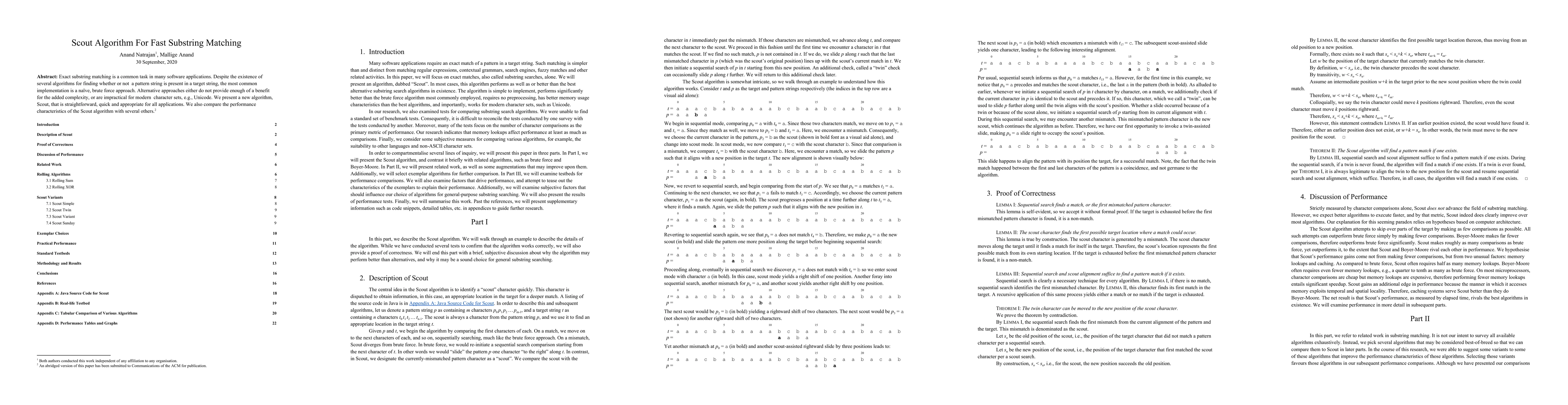 The Scout algorithm offers a straightforward and efficient solution for exact substring matching, outperforming common brute force methods and other complex alternatives. Performance comparisons show Scout to be both quick and practical for modern character sets like Unicode.