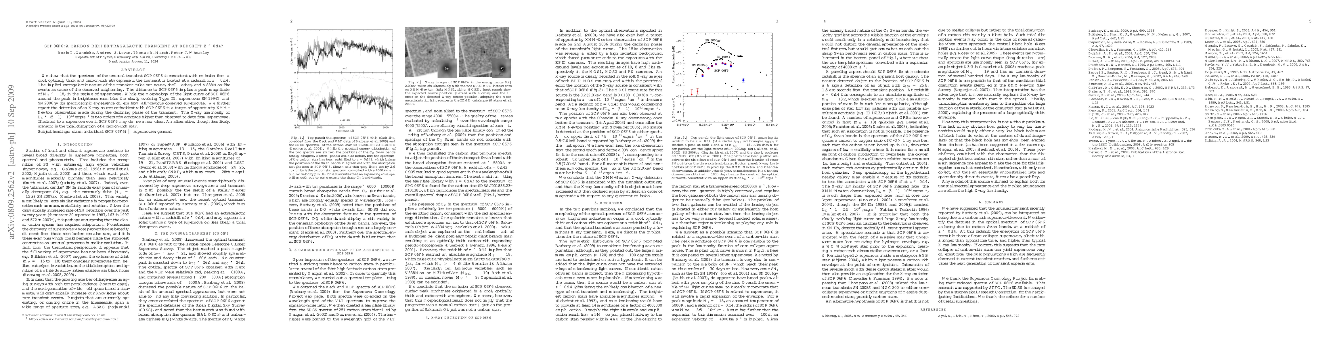 We show that the spectrum of the unusual transient SCP06F6 is consistent with emission from a cool, optically thick and carbon-rich atmosphere if the transient is located at a redshift of z~0.14. The implied extragalactic nature of the transient rules out novae, shell flashes, and V838 Mon-like events as cause of the observed brightening. The distance to SCP06F6 implies a peak magnitude of M_I ~- 18, in the regime of supernovae. While the morphology of the light curve of SCP06F6 around the peak in brightness resembles the slowly evolving Type IIn supernovae SN1994Y and SN2006gy its spectroscopic appearence differs from all previous observed supernovae. We further report the detection of an X-ray source co-incident with SCP06F6 in a target of opportunity XMM-Newton observation made during the declining phase of the transient. The X-ray luminosity of L_X ~- (5+-1)e42 erg/s is two orders of magnitude higher than observed to date from supernovae. If related to a supernova event, SCP06F6 may define a new class. An alternative, though less likely, scenario is the tidal disruption of a carbon-rich star.