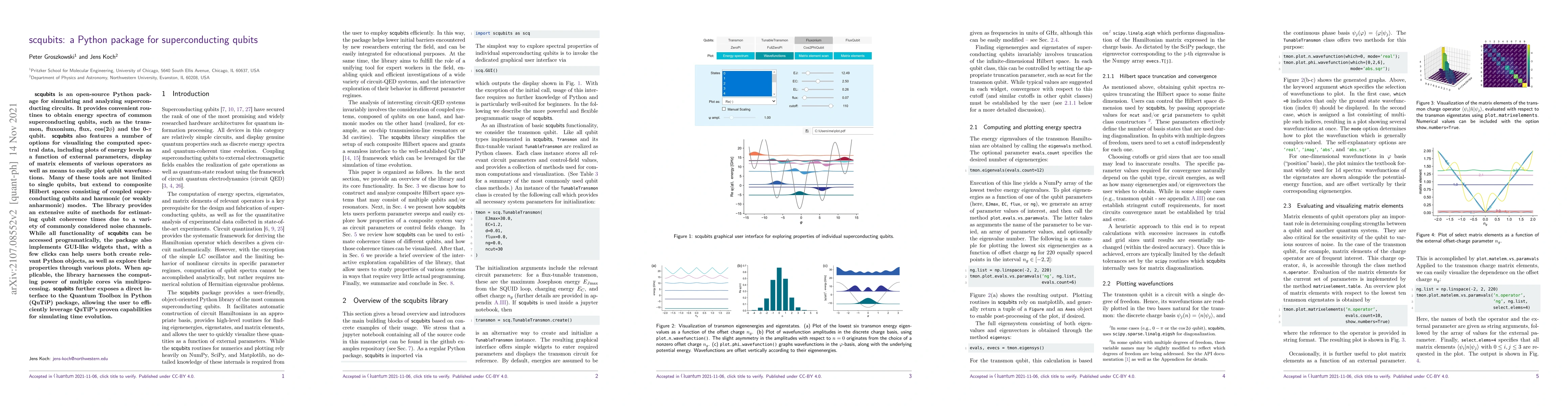 The `scqubits` Python package offers tools for simulating and analyzing superconducting qubits, including energy spectrum calculations, visualization of spectral data, and estimation of coherence times. It supports various qubit types and multi-qubit systems, and integrates with the Quantum Toolbox in Python for time evolution simulations.