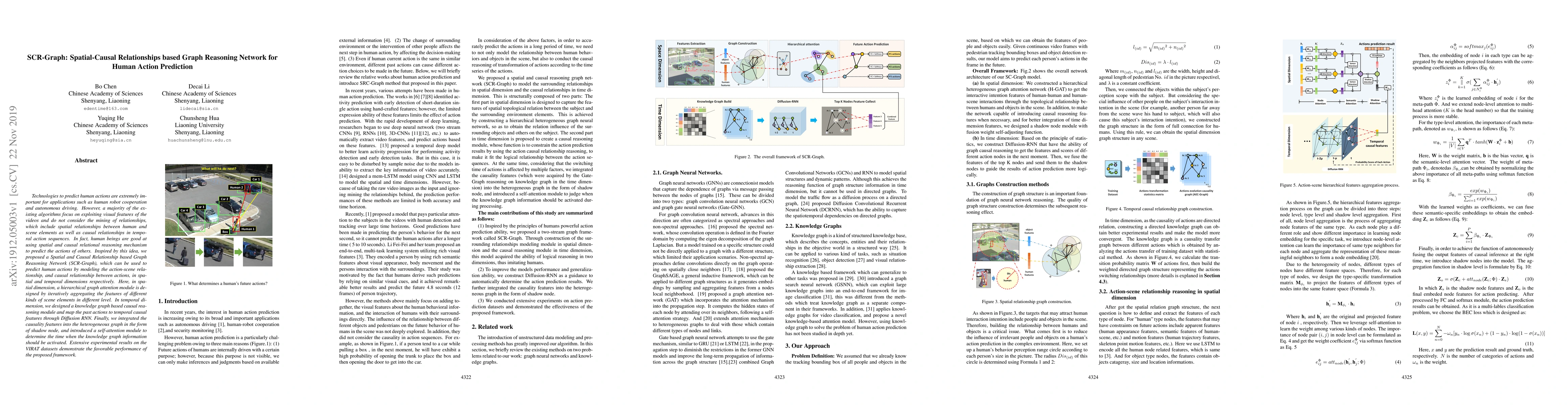 The SCR-Graph network predicts human actions by modeling spatial-causal relationships using a hierarchical graph attention module for spatial features and a knowledge graph-based causal reasoning module for temporal features, achieving superior performance on VIRAT datasets.