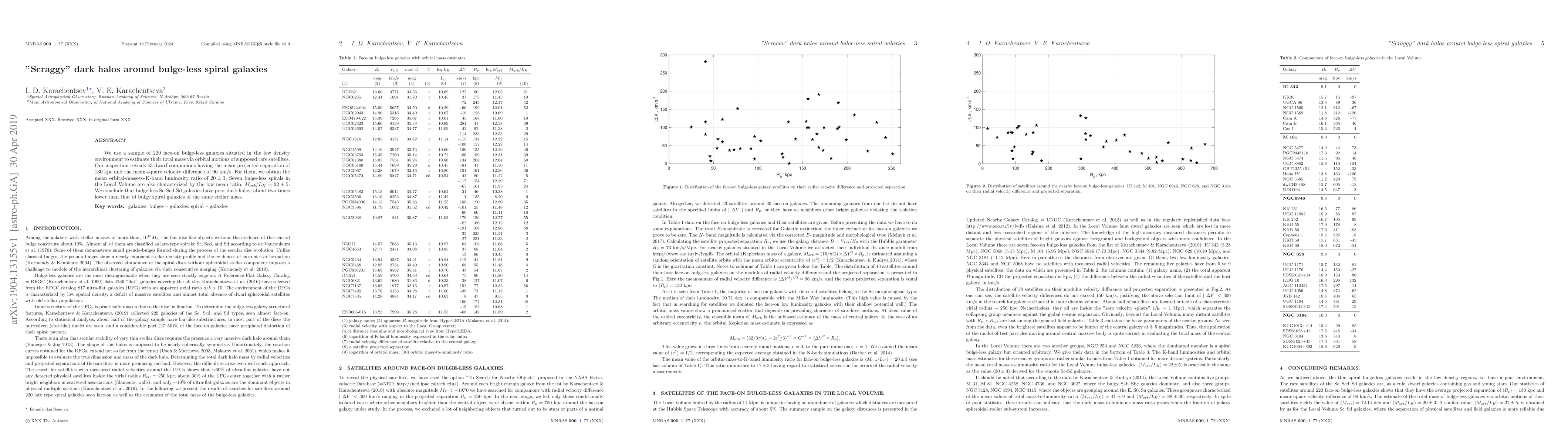 We use a sample of 220 face-on bulge-less galaxies situated in the low density environment to estimate their total mass via orbital motions of supposed rare satellites. Our inspection reveals 43 dwarf companions having the mean projected separation of 130 kpc and the mean-square velocity difference of 96 km/s. For them, we obtain the mean orbital-mass-to-K-band luminosity ratio of $20\pm3$. Seven bulge-less spirals in the Local Volume are also characterized by the low mean ratio, $M_{orb}/L_K = 22\pm5$. We conclude that bulge-less Sc-Scd-Sd galaxies have poor dark halos, about two times lower than that of bulgy spiral galaxies of the same stellar mass.