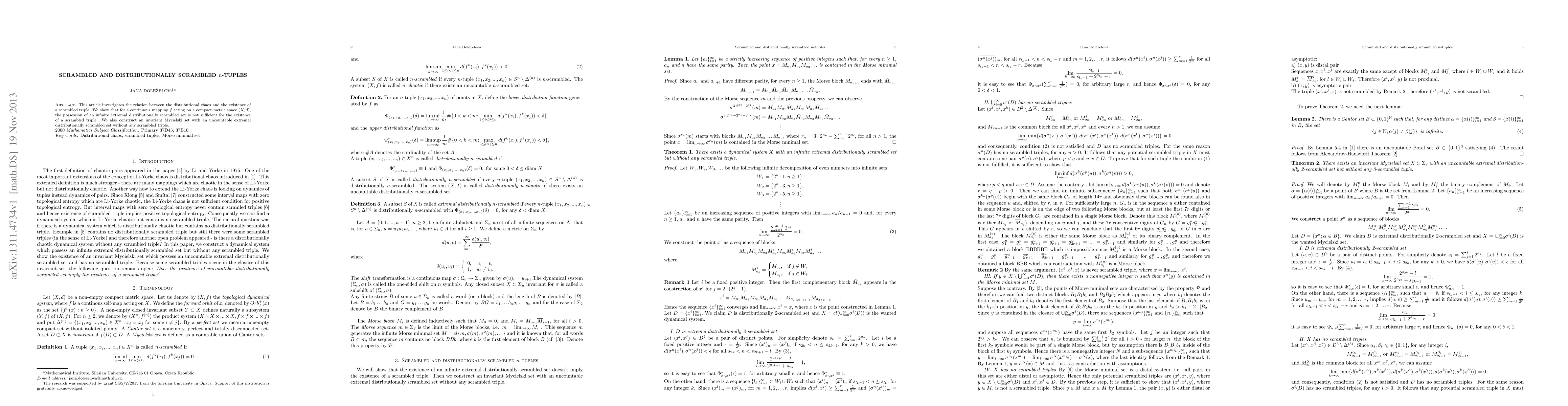 This article investigates the relation between the distributional chaos and the existence of a scrambled triple. We show that for a continuous mapping $f$ acting on a compact metric space $(X,d)$, the possession of an infinite extremal distributionally scrambled set is not sufficient for the existence of a scrambled triple. We also construct an invariant Mycielski set with an uncountable extremal distributionally scrambled set without any scrambled triple.