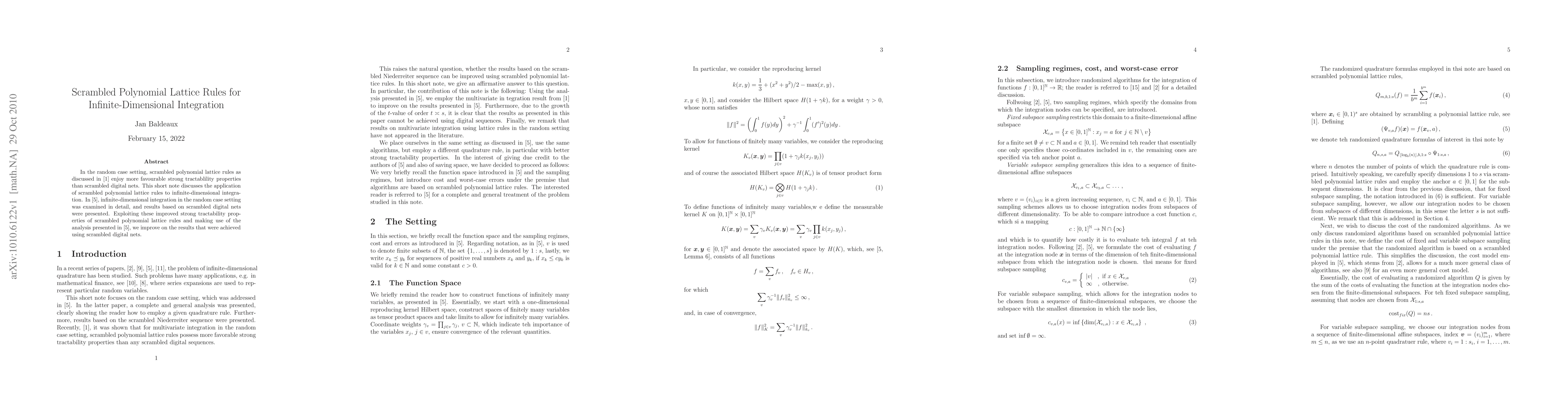 This paper explores the application of scrambled polynomial lattice rules to infinite-dimensional integration, demonstrating improved strong tractability properties compared to scrambled digital nets. Building on prior analysis from \cite{HMGNR10}, it enhances the results previously obtained using scrambled digital nets.