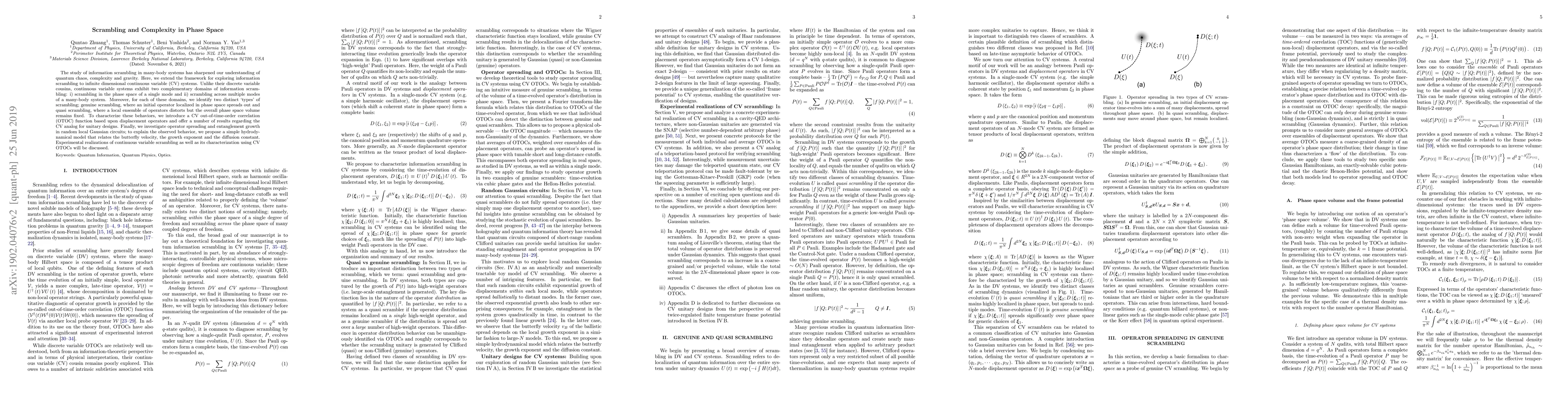 The study of information scrambling in many-body systems has sharpened our understanding of quantum chaos, complexity and gravity. Here, we extend the framework for exploring information scrambling to infinite dimensional continuous variable (CV) systems. Unlike their discrete variable cousins, continuous variable systems exhibit two complementary domains of information scrambling: i) scrambling in the phase space of a single mode and ii) scrambling across multiple modes of a many-body system. Moreover, for each of these domains, we identify two distinct `types' of scrambling; genuine scrambling, where an initial operator localized in phase space spreads out and quasi scrambling, where a local ensemble of operators distorts but the overall phase space volume remains fixed. To characterize these behaviors, we introduce a CV out-of-time-order correlation (OTOC) function based upon displacement operators and offer a number of results regarding the CV analog for unitary designs. Finally, we investigate operator spreading and entanglement growth in random local Gaussian circuits; to explain the observed behavior, we propose a simple hydrodynamical model that relates the butterfly velocity, the growth exponent and the diffusion constant. Experimental realizations of continuous variable scrambling as well as its characterization using CV OTOCs will be discussed.