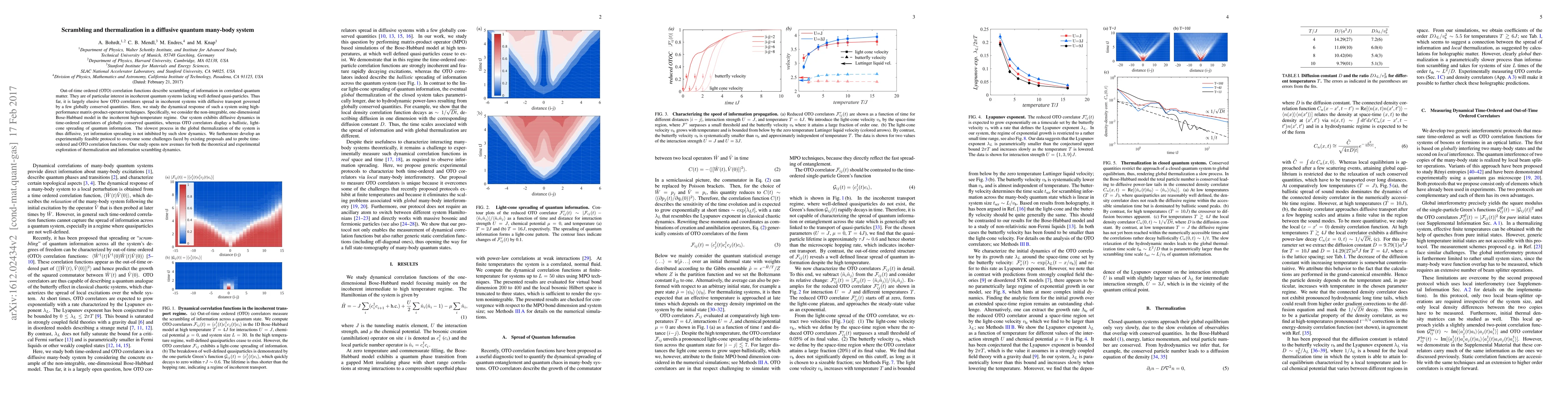 Out-of-time ordered (OTO) correlation functions describe scrambling of information in correlated quantum matter. They are of particular interest in incoherent quantum systems lacking well defined quasi-particles. Thus far, it is largely elusive how OTO correlators spread in incoherent systems with diffusive transport governed by a few globally conserved quantities. Here, we study the dynamical response of such a system using high-performance matrix-product-operator techniques. Specifically, we consider the non-integrable, one-dimensional Bose-Hubbard model in the incoherent high-temperature regime. Our system exhibits diffusive dynamics in time-ordered correlators of globally conserved quantities, whereas OTO correlators display a ballistic, light-cone spreading of quantum information. The slowest process in the global thermalization of the system is thus diffusive, yet information spreading is not inhibited by such slow dynamics. We furthermore develop an experimentally feasible protocol to overcome some challenges faced by existing proposals and to probe time-ordered and OTO correlation functions. Our study opens new avenues for both the theoretical and experimental exploration of thermalization and information scrambling dynamics.