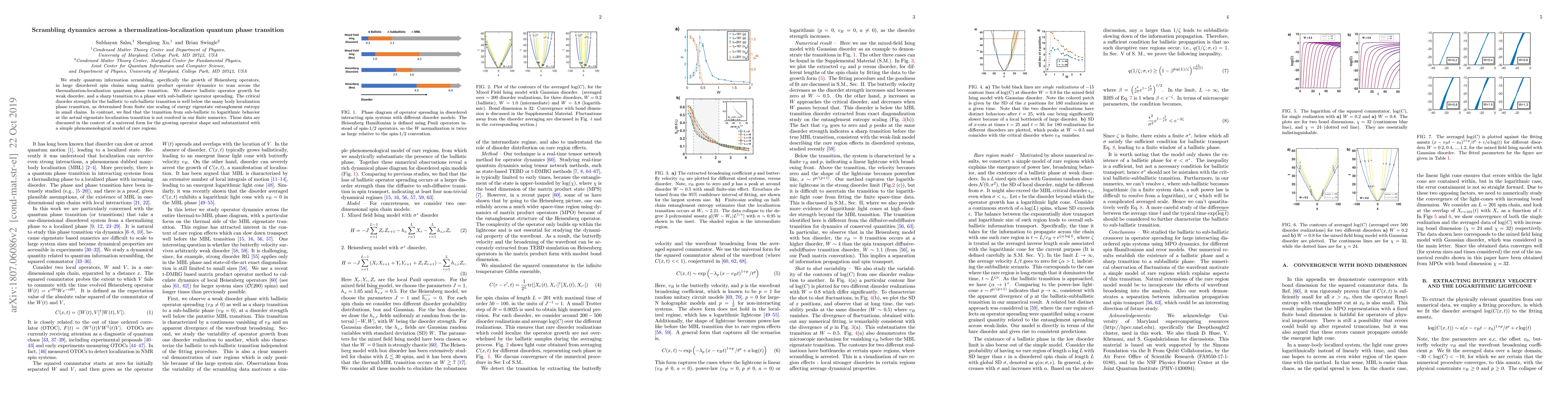 This paper investigates the dynamics of quantum information scrambling in disordered spin chains, revealing a transition from ballistic to sub-ballistic growth of Heisenberg operators. The study finds that this transition occurs well before the many-body localization phase transition, though the latter's transition to logarithmic behavior is not fully resolved.
