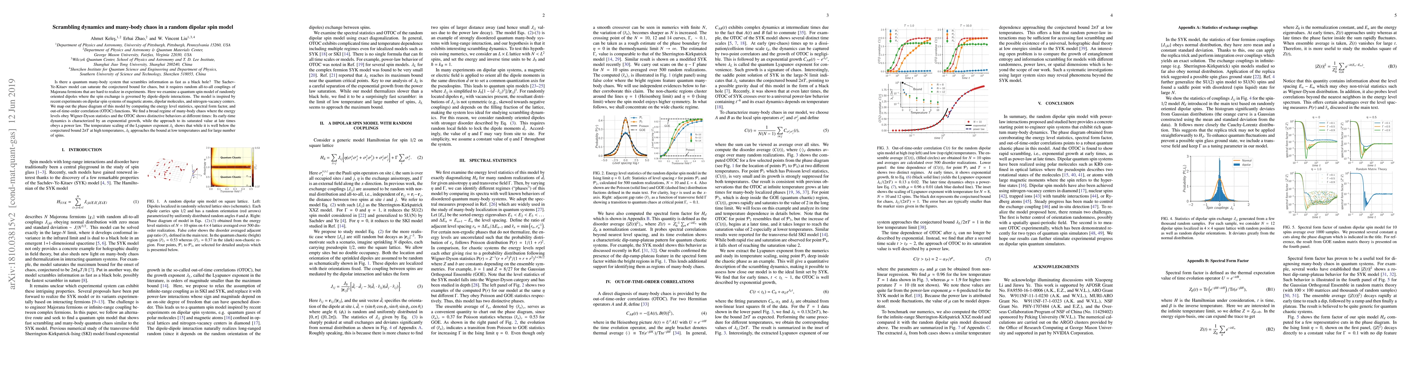 This paper investigates a quantum spin model based on randomly oriented dipoles, exploring its dynamics and many-body chaos. The study reveals a broad regime of chaos with energy level statistics and out-of-time-order correlation functions indicating both exponential and power law behaviors, with the Lyapunov exponent approaching theoretical bounds at low temperatures.
