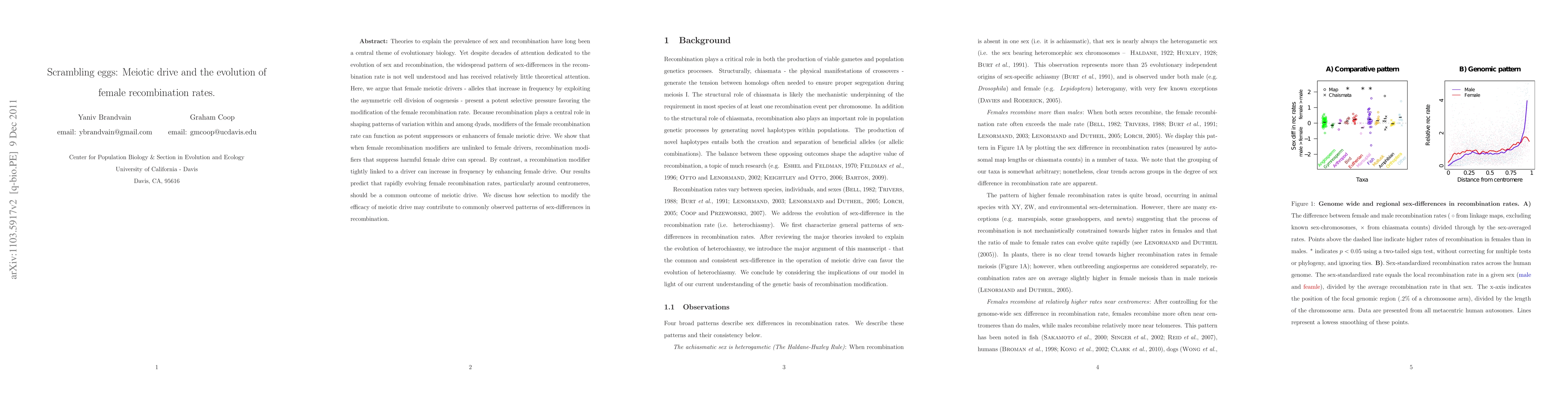 This paper explores how female meiotic drivers—alleles that exploit oogenesis to increase in frequency—can drive the evolution of female recombination rates. It argues that recombination modifiers can suppress or enhance female meiotic drive, leading to rapid evolution of female recombination rates, particularly around centromeres, and contributing to sex-differences in recombination.