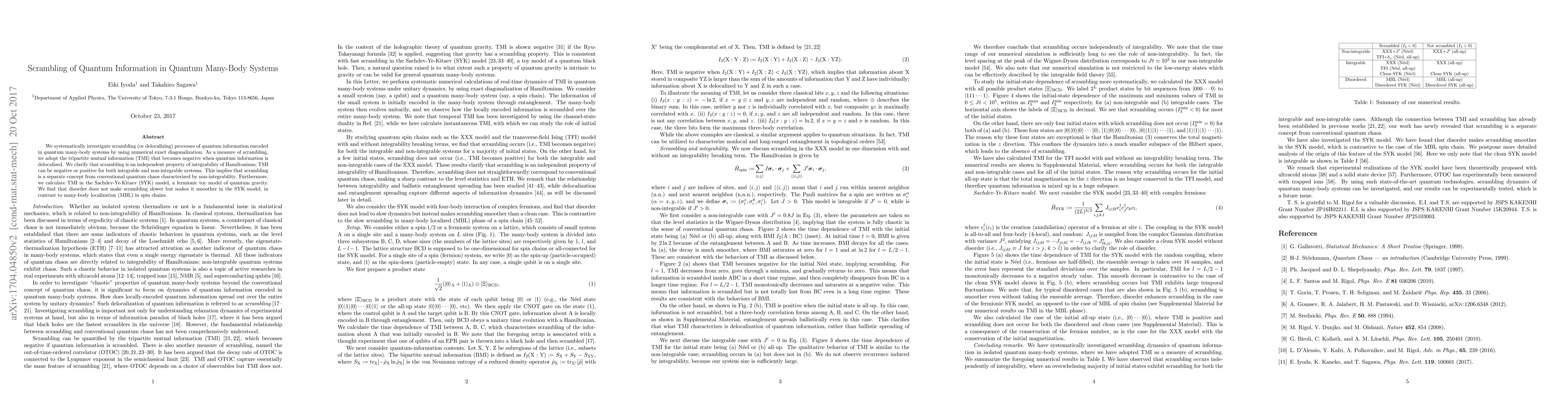 This study examines the scrambling of quantum information in quantum many-body systems using numerical exact diagonalization, revealing that scrambling is a distinct phenomenon from quantum chaos, occurring independently of system integrability. It also finds that scrambling is slow in many-body localized systems but remains rapid and smooth in the disordered Sachdev-Ye-Kitaev model.