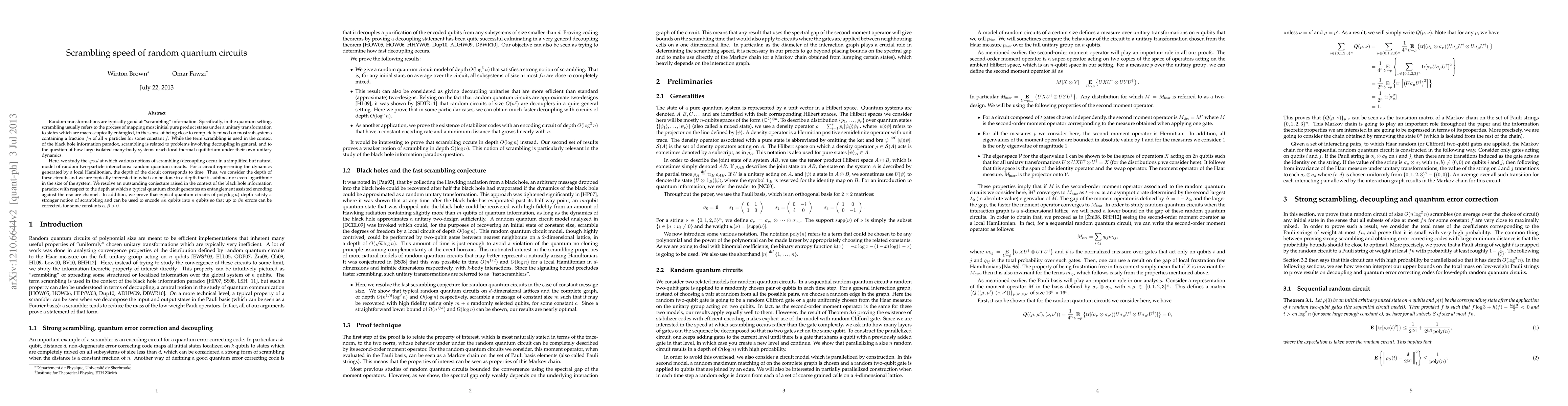 Random transformations are typically good at "scrambling" information. Specifically, in the quantum setting, scrambling usually refers to the process of mapping most initial pure product states under a unitary transformation to states which are macroscopically entangled, in the sense of being close to completely mixed on most subsystems containing a fraction fn of all n particles for some constant f. While the term scrambling is used in the context of the black hole information paradox, scrambling is related to problems involving decoupling in general, and to the question of how large isolated many-body systems reach local thermal equilibrium under their own unitary dynamics. Here, we study the speed at which various notions of scrambling/decoupling occur in a simplified but natural model of random two-particle interactions: random quantum circuits. For a circuit representing the dynamics generated by a local Hamiltonian, the depth of the circuit corresponds to time. Thus, we consider the depth of these circuits and we are typically interested in what can be done in a depth that is sublinear or even logarithmic in the size of the system. We resolve an outstanding conjecture raised in the context of the black hole information paradox with respect to the depth at which a typical quantum circuit generates an entanglement assisted encoding against the erasure channel. In addition, we prove that typical quantum circuits of poly(log n) depth satisfy a stronger notion of scrambling and can be used to encode alpha n qubits into n qubits so that up to beta n errors can be corrected, for some constants alpha, beta > 0.
