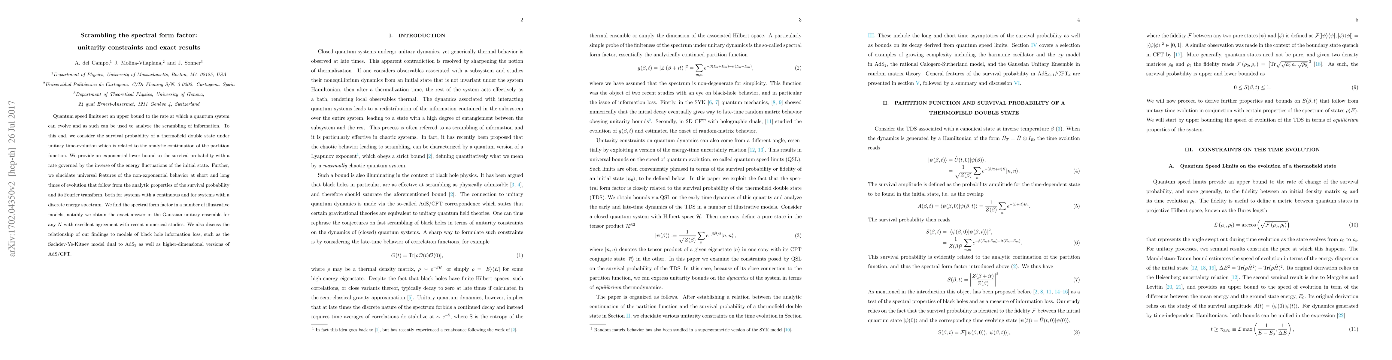 Quantum speed limits set an upper bound to the rate at which a quantum system can evolve and as such can be used to analyze the scrambling of information. To this end, we consider the survival probability of a thermofield double state under unitary time-evolution which is related to the analytic continuation of the partition function. We provide an exponential lower bound to the survival probability with a rate governed by the inverse of the energy fluctuations of the initial state. Further, we elucidate universal features of the non-exponential behavior at short and long times of evolution that follow from the analytic properties of the survival probability and its Fourier transform, both for systems with a continuous and a discrete energy spectrum. We find the spectral form factor in a number of illustrative models, notably we obtain the exact answer in the Gaussian unitary ensemble for any $N$ with excellent agreement with recent numerical studies. We also discuss the relationship of our findings to models of black hole information loss, such as the Sachdev-Ye-Kitaev model dual to AdS$_2$ as well as higher-dimensional versions of AdS/CFT.