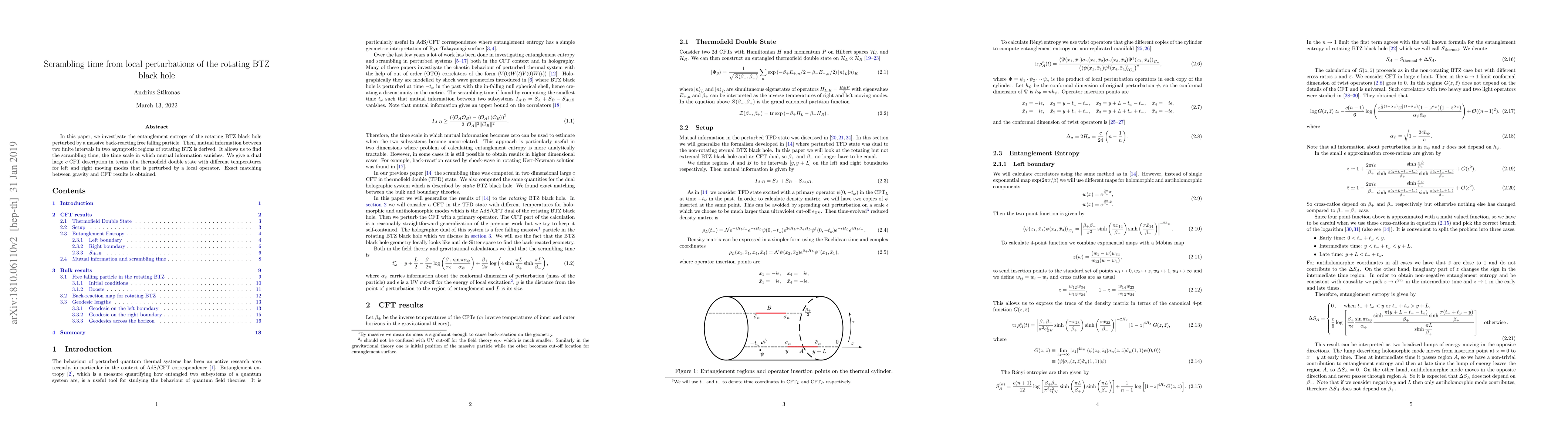 In this paper, we investigate the entanglement entropy of the rotating BTZ black hole perturbed by a massive back-reacting free falling particle. Then, mutual information between two finite intervals in two asymptotic regions of rotating BTZ is derived. It allows us to find the scrambling time, the time scale in which mutual information vanishes. We give a dual large $c$ CFT description in terms of a thermofield double state with different temperatures for left and right moving modes that is perturbed by a local operator. Exact matching between gravity and CFT results is obtained.