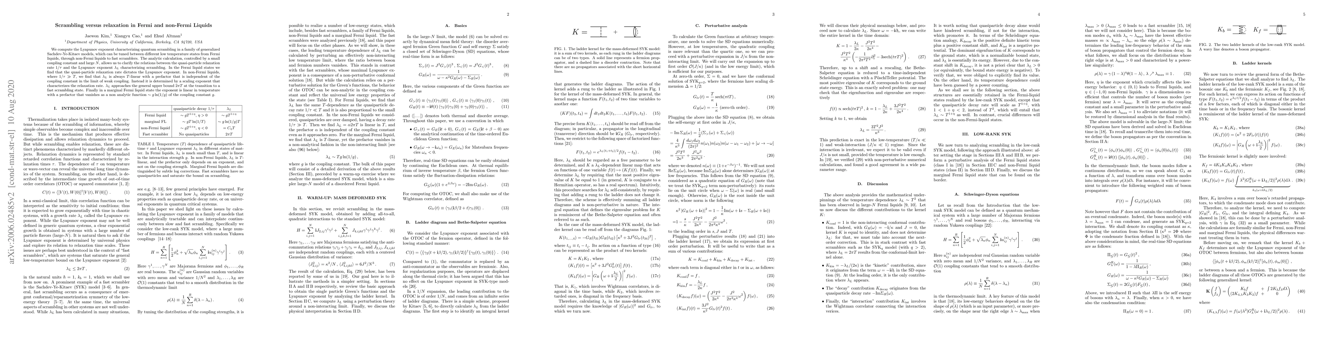 We compute the Lyapunov exponent characterizing quantum scrambling in a family of generalized Sachdev-Ye-Kitaev models, which can be tuned between different low temperature states from Fermi liquids, through non-Fermi liquids to fast scramblers. The analytic calculation, controlled by a small coupling constant and large $N$, allows us to clarify the relations between the quasi-particle relaxation rate $1/\tau$ and the Lyapunov exponent $\lambda_L$ characterizing scrambling. In the Fermi liquid states we find that the quasi-particle relaxation rate dictates the Lyapunov exponent. In non-Fermi liquids, where $1/\tau \gg T$, we find that $\lambda_L$ is always $T$-linear with a prefactor that is independent of the coupling constant in the limit of weak coupling. Instead it is determined by a scaling exponent that characterizes the relaxation rate. $\lambda_L$ approaches the general upper bound $2\pi T$ at the transition to a fast scrambling state. Finally in a marginal Fermi liquid state the exponent is linear in temperature with a prefactor that vanishes as a non analytic function $\sim g \ln (1/g)$ of the coupling constant $g$.