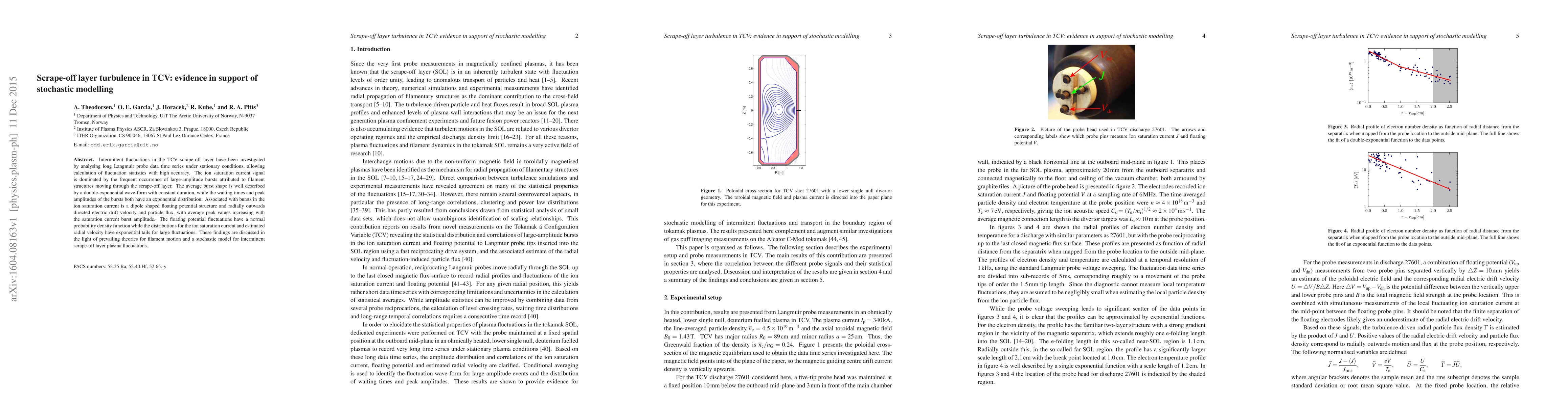 This paper investigates intermittent fluctuations in the TCV scrape-off layer using Langmuir probe data, revealing large-amplitude bursts linked to filament structures. The findings support a stochastic model, showing exponential distributions for burst waiting times and peak amplitudes, and suggesting a double-exponential wave-form for the average burst shape.