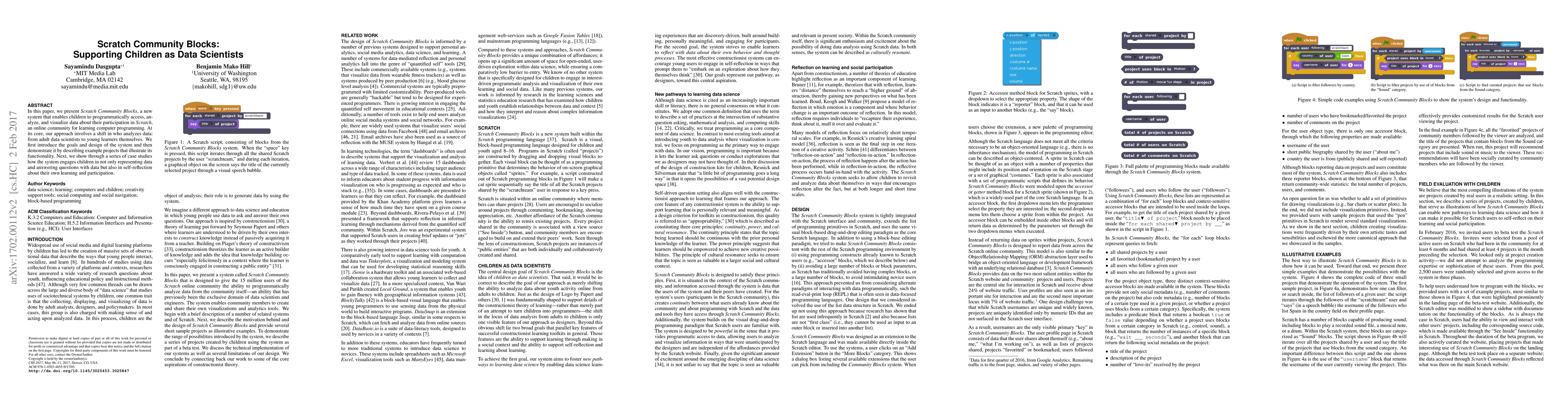 Scratch Community Blocks empowers children to analyze and visualize their own data from the Scratch programming community, shifting the role of data analysis from adults to young learners. Through case studies, the paper demonstrates how children engage in data representation, question-answering, and self-reflection about their learning and participation.